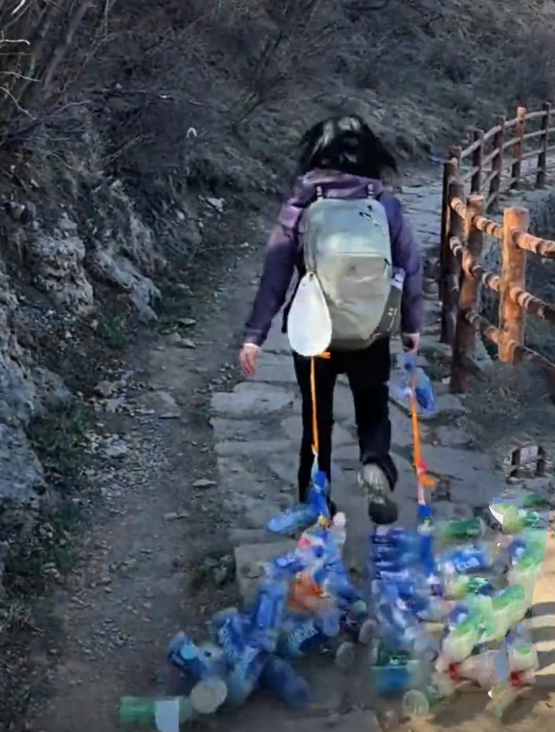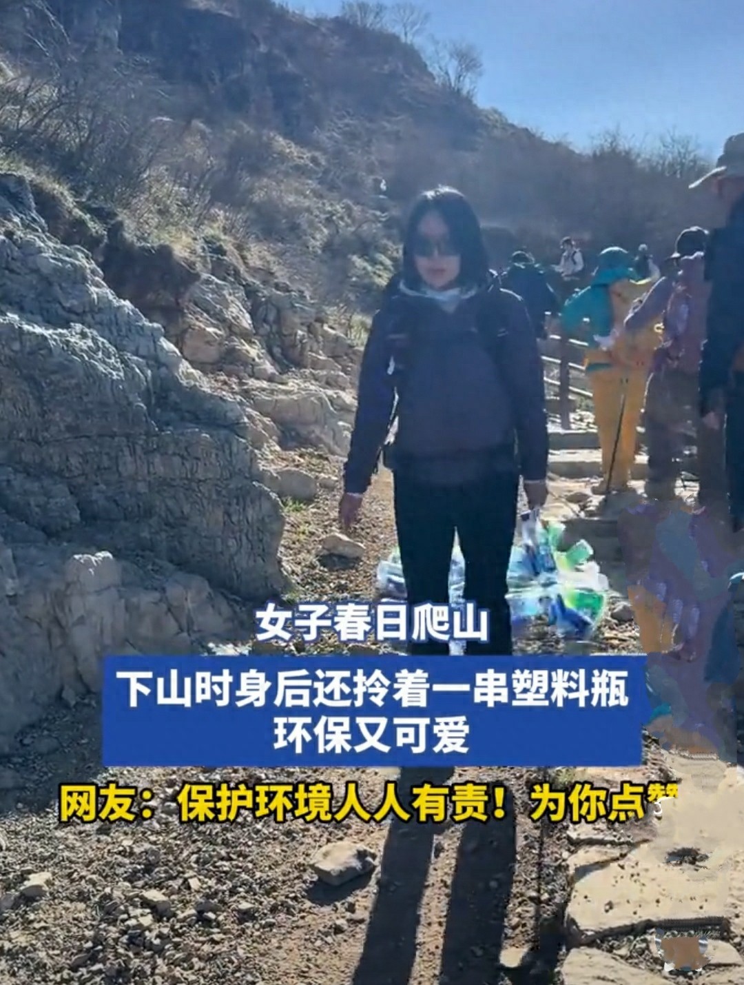 而且小姐姐把塑料瓶串成一串拎着,这脑洞也太可爱了吧!既不用手忙脚乱拿一堆,又能一次性带走,妥妥的环保小妙招,网友都调侃:“这是解锁了爬山捡垃圾的新姿势,主打一个方便又拉风!”还有人说:“这串塑料瓶,是小姐姐的春日环保勋章,比任何配饰都亮眼!”
