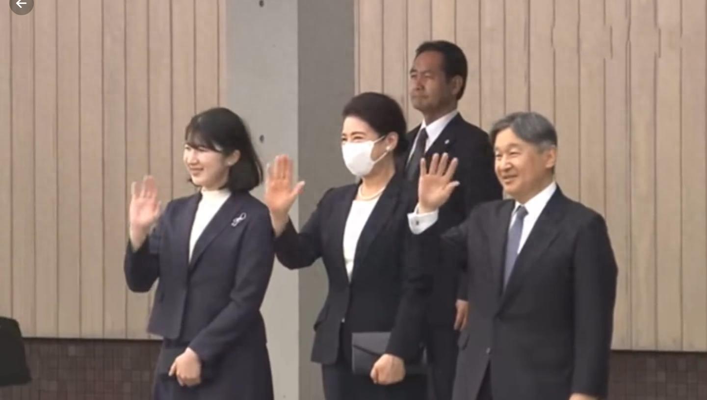 皇后雅子也是穿黑色服装,不过并没有穿裙装,一身裤装造型佩戴珍珠项链,尽显优雅又贵气;一家三口雅子站在中间,德仁穿着一身西服套装系着领带,白头发又多了。