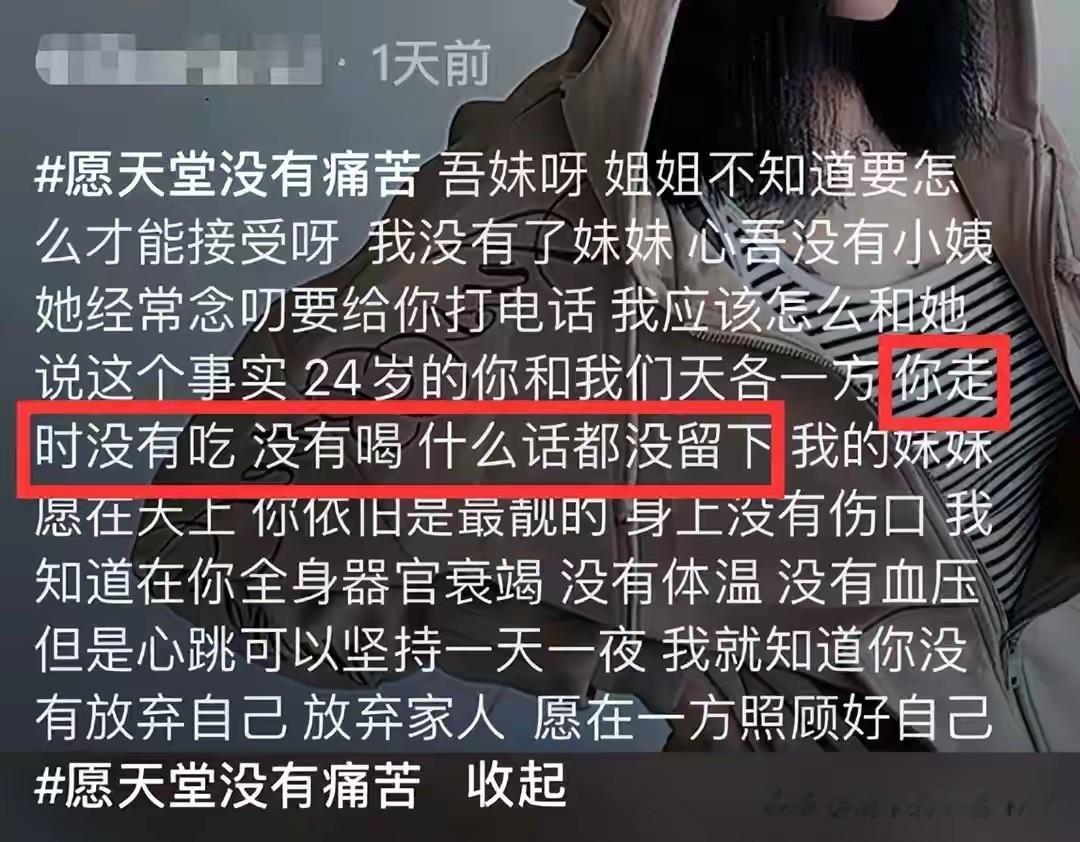 24岁,多么美好的年纪,她的人生才刚刚拉开序幕,还有无数的风景等着她去看,还有无数的梦想等着她去实现。可如今,她却躺在冷冰冰的棺木中,再也无法醒来。她的大好青春,就这样戛然而止,留给家人的,是无尽的痛苦与思念。