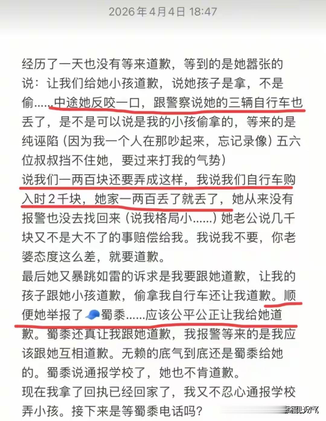 她全程都在胡搅蛮缠,坚持认为孩子只是“不小心骑错了”“临时骑着玩”,坚决不承认是私自拿别人的东西,更不接受“偷骑”的说法,哪怕李女士拿出证据,说明车子是自己的,孩子是从1栋骑到7栋,距离几百米,根本不存在骑错的可能,她依旧拒不认错,反而觉得李女士在故意刁难她们。