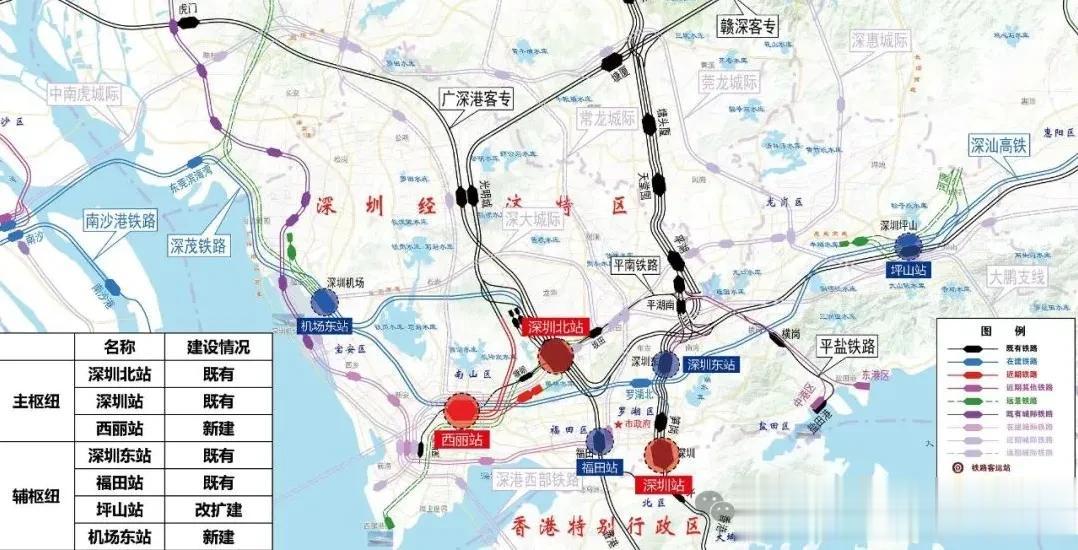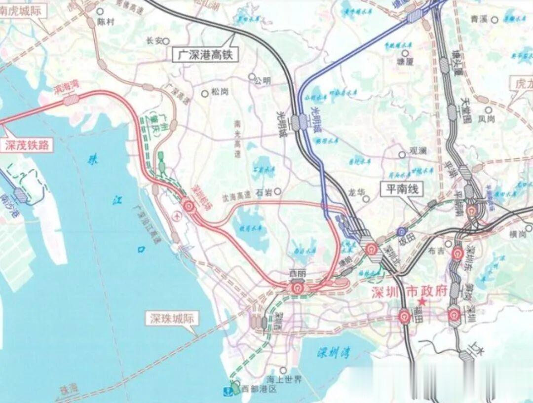 西丽高铁站未来将引入4条高铁——赣深高铁、深茂铁路、深汕铁路、深珠高铁;2条城际铁路——深惠城际、深莞增城际;4条地铁线路——13号线、15号线、27号线和29号线,形成“4高铁+2城际+4地铁”的多层级轨交网络,完善大湾区轨道交通网络布局。