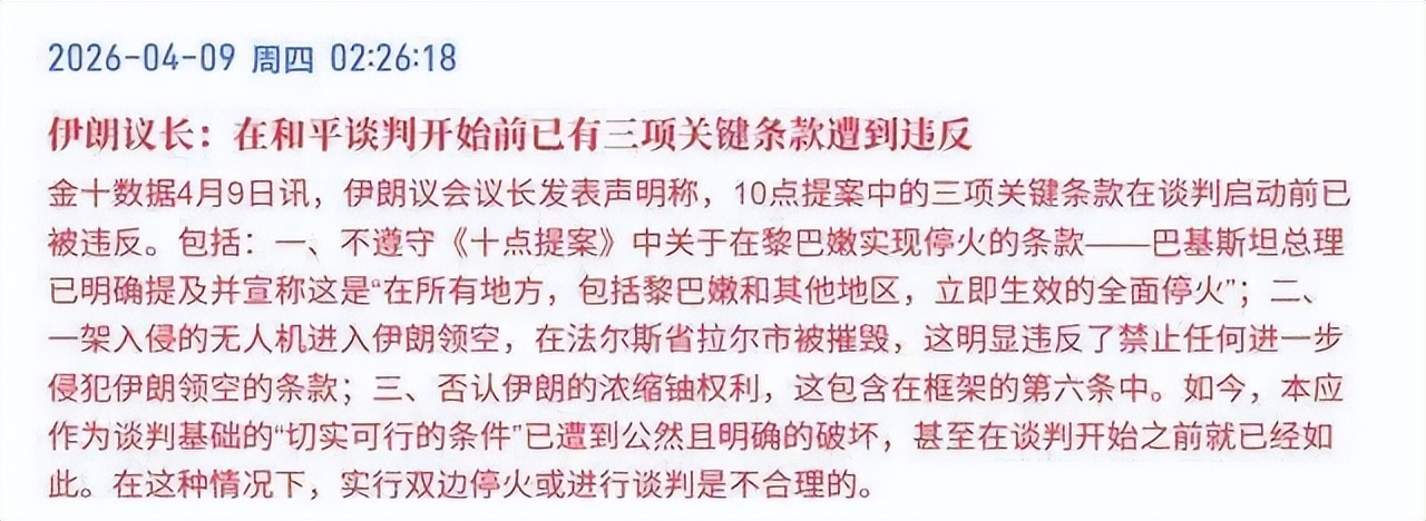 这还没完,伊朗伊朗议长更是直接表示,还没开始谈判呢就已经违反了三项条款,这个情况下还进行谈判根本就不合理。