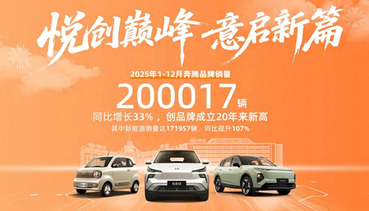 去年12月24日,一汽奔腾难掩喜悦,率先公布了破19万辆的业绩,随后,年终销量数据定格在了200017辆。其中新能源销量达171957辆,同比提升107%。