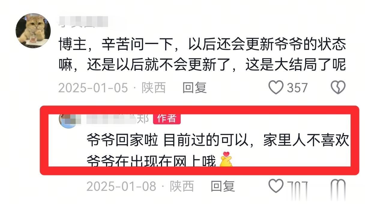 2025年的一月份的时候,有网友们问博主爷爷的情况,当时博主给网友回复称爷爷回家了,目前过得还可以,家里人不喜欢爷爷再出现在网上。