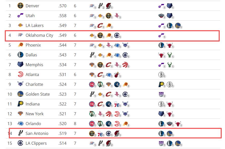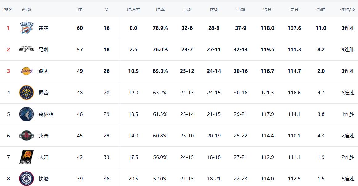 雷霆剩余6场比赛,对手中有2次湖人、1次掘金、1次太阳、1次快船,四支胜率在50%以上的球队。