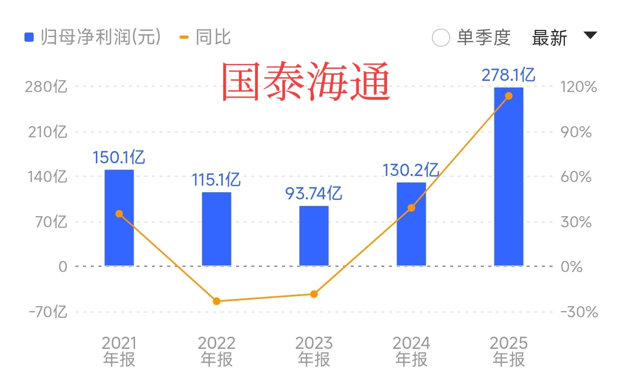 国泰海通2021年以来历年净利润分别是:150亿元。115亿元,94亿元,130亿元,278亿元。