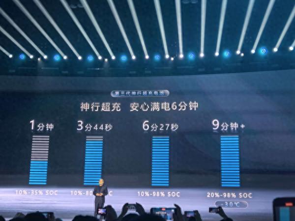 宁德时代首席科学家,工程院院士吴凯的介绍,常温环境下,宁德时代第三代神行超充电池已经实现了等效10C、峰值15C的超充能力。具体到应用场景中,车辆从10%电量充至35%仅需1分钟,充至80%耗时3分44秒,充至98%的总计时间被定格在6分27秒。