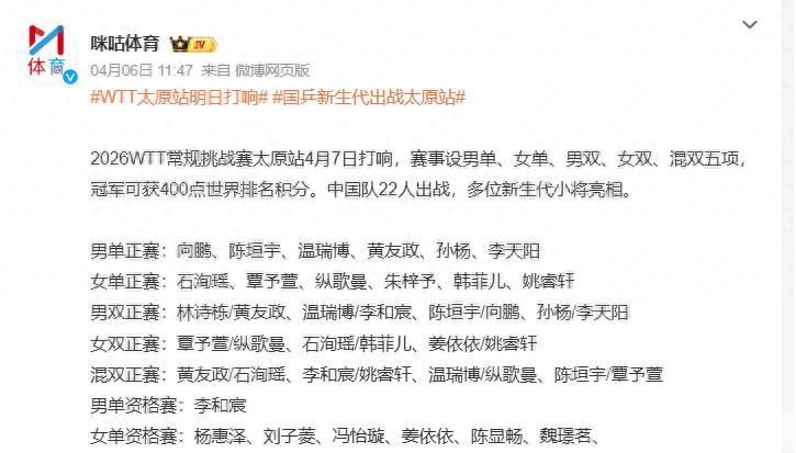 北京时间4月7日,澳门世界杯结束后,WTT太原常规挑战赛今日开打,国乒的比赛接踵而至!不过,国乒主力并不参加,孙颖莎、王楚钦、王曼昱等核心,将获得充分的休息时间,为4月底的世乒赛团体赛做好准备!