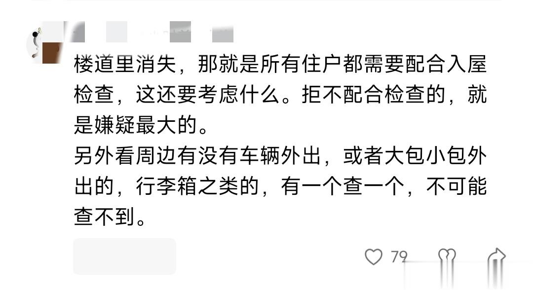 有网友说,孩子在楼道里消失,所有住户都该配合入户检查,拒不配合的嫌疑最大,还要排查外出车辆、行李等,不可能查不到。我觉得这个排查思路很到位。