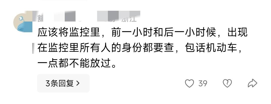 有网友说,要把监控里前后一小时出现的所有人身份都查清楚,包括机动车,一个都不能放过。我觉得细节排查确实很关键。