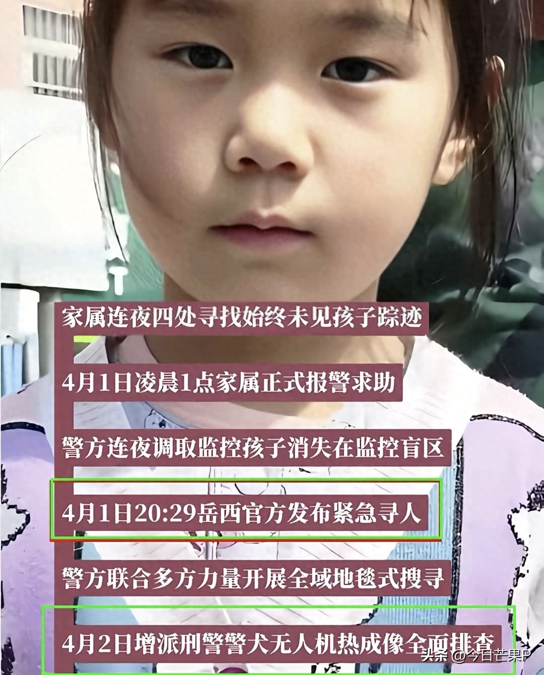 3月31号晚上8点多,安徽岳西县一个6岁女孩甜甜从家里出来往楼梯口走,妈妈亲眼看着她离开,20分钟后妈妈发现孩子不见了,当晚10点40分报了警,两天后警方把案子定为疑似被拐和非法拘禁,到现在已经整整四天,一点线索都没有。