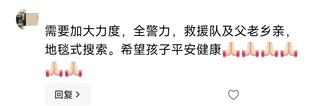 有网友说,需要加大力度,全警力、救援队和乡亲们一起地毯式搜索,希望孩子平安健康。我觉得真心祈祷孩子能平安回来。