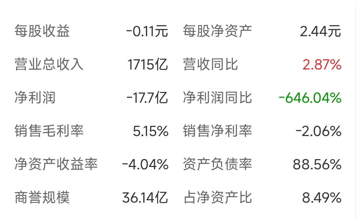 实现营业收入1399亿元,同比增长5.9%;实现净利润-19.5亿元(亏损),归属于母公司股东的净利润-16.3亿元,亏损大幅减少26亿元。