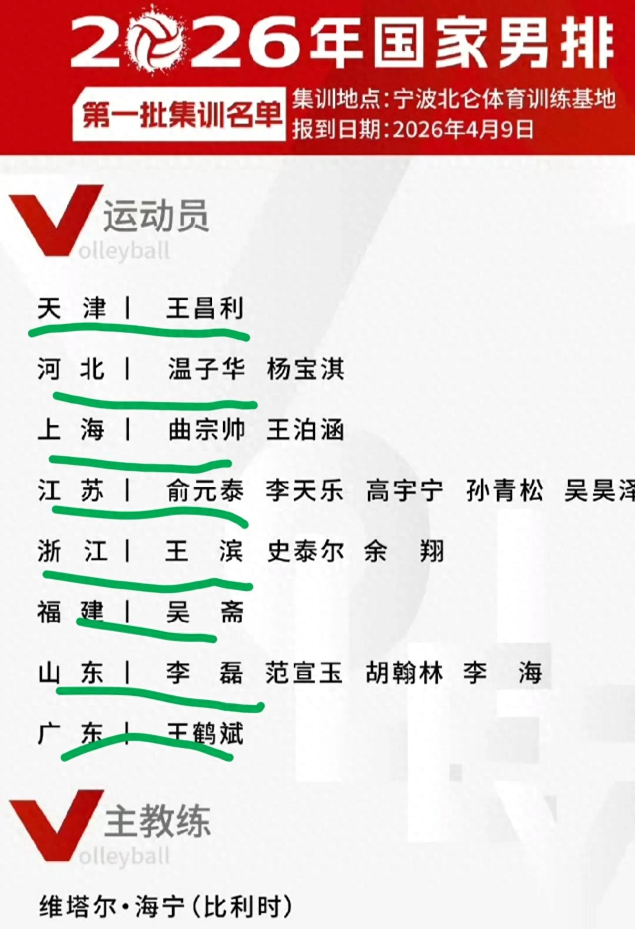 中国排协发文写道,2026年国家男排第一批集训名单,中国男排将在宁波北仑体育训练基地展开集训。名单如下: