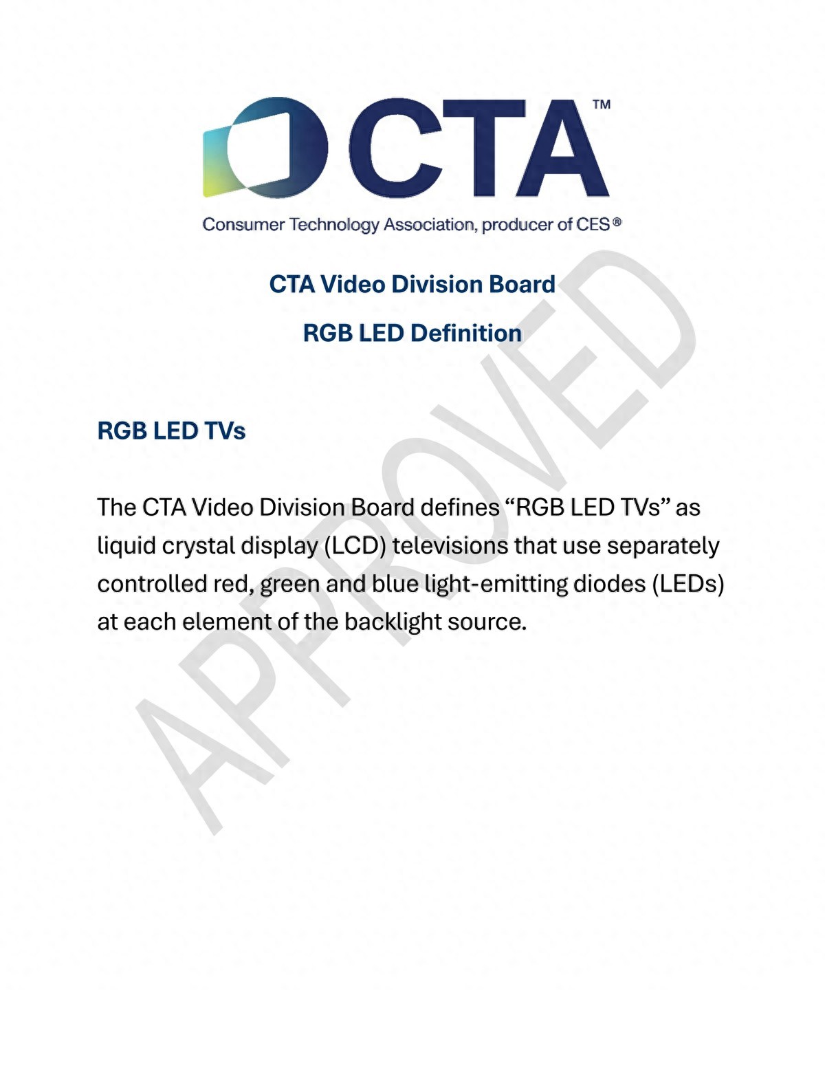 作为拥有超百年历史、CES主办方,以及全球“4K Ultra HD”“8K”“HDR”等历代电视显示核心标准的制定者,CTA首次明确界定核心准则:RGB-Mini LED电视必须在背光光源的每一个单元,实现红、绿、蓝三色LED独立控制,为全球RGB LED电视树立合规标尺。