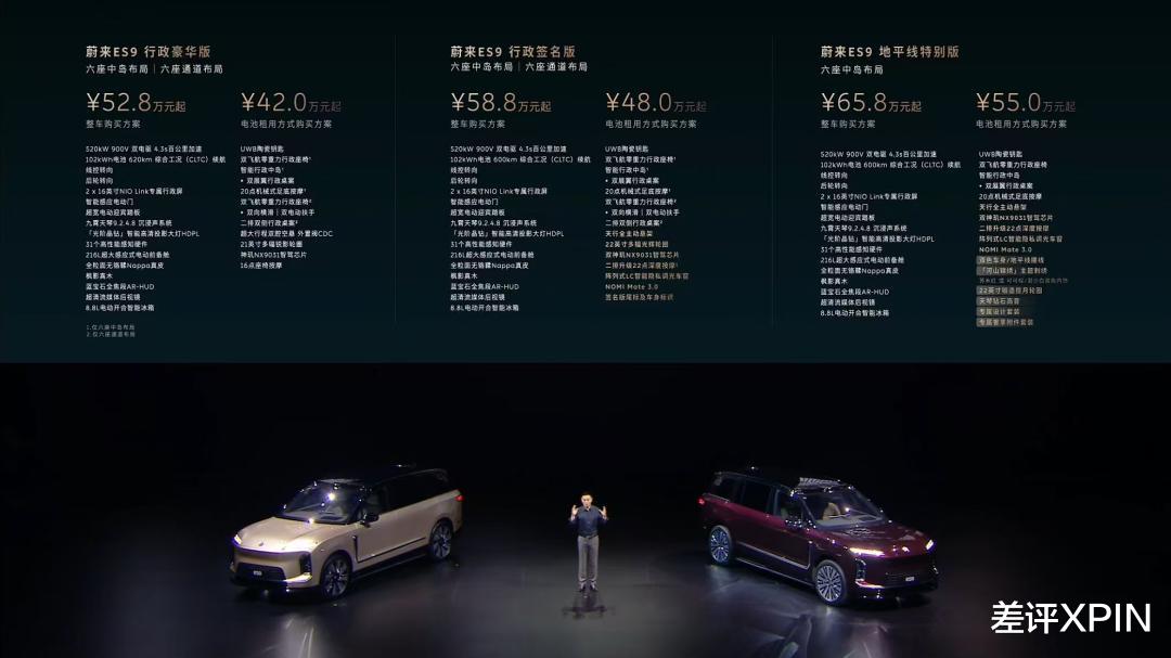 老规矩,先来说价格,ES9 这次一共三个配置,预售价格分别是 52.8 万、58.8 万和 65.8 万,BaaS 之后则是 42万、48 万和 55 万,嚯,这真不算便宜啊。