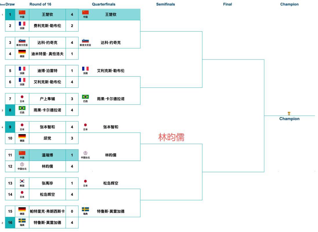 林昀儒分在下半区,在淘汰张本智和后,他在半决赛的对手是松岛辉空和莫雷加德的胜者,如果打进决赛的话,可能会和国乒的王楚钦相遇!王楚钦和林昀儒是关系非常好的朋友,他们在乒超联赛还是队友,彼此非常熟悉,希望都能闯入决赛吧!