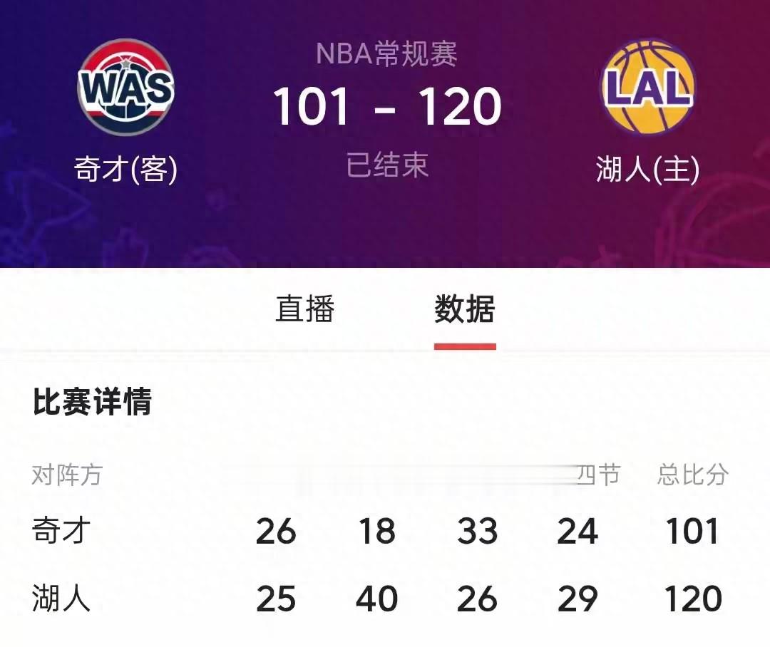 末节决战,湖人没有再给对手机会。海斯继续在内线得分,范德比尔特罚球命中。詹姆斯外线三分命中,将分差重新拉开到20分以上,个人也早早达到了三双数据。随后湖人持续发力,分差一度拉开至30分。奇才无力回天,比赛彻底失去悬念。最终,湖人主场以120-101轻松战胜奇才。