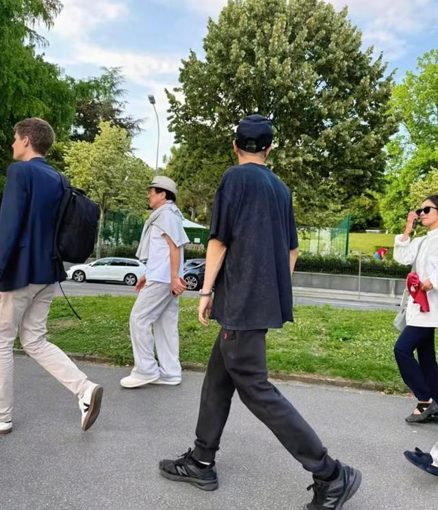 成龙穿一件浅灰色短袖T恤,脚上是一双普通的运动鞋,跟普通的退休大爷没什么区别。