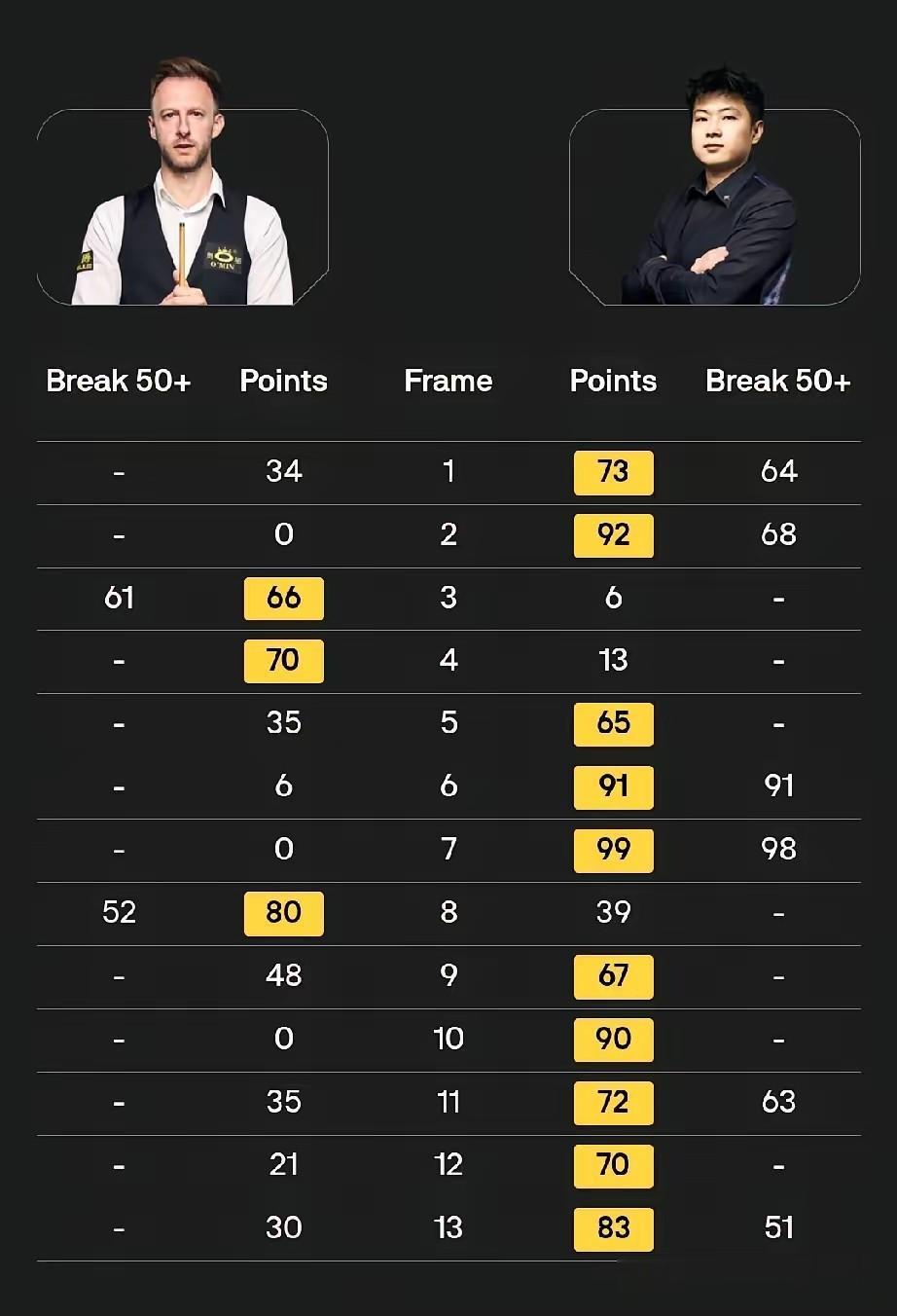 第二个不可思议,是全场零破百却横扫世界第一。在现代斯诺克语境里,破百数量往往被视作进攻能力的硬指标。很多顶级选手单场比赛破百数甚至能达到三四杆,以此展现强大火力。如果换作其他选手,全场零破百大概率会被评价为状态一般、进攻火力不足。