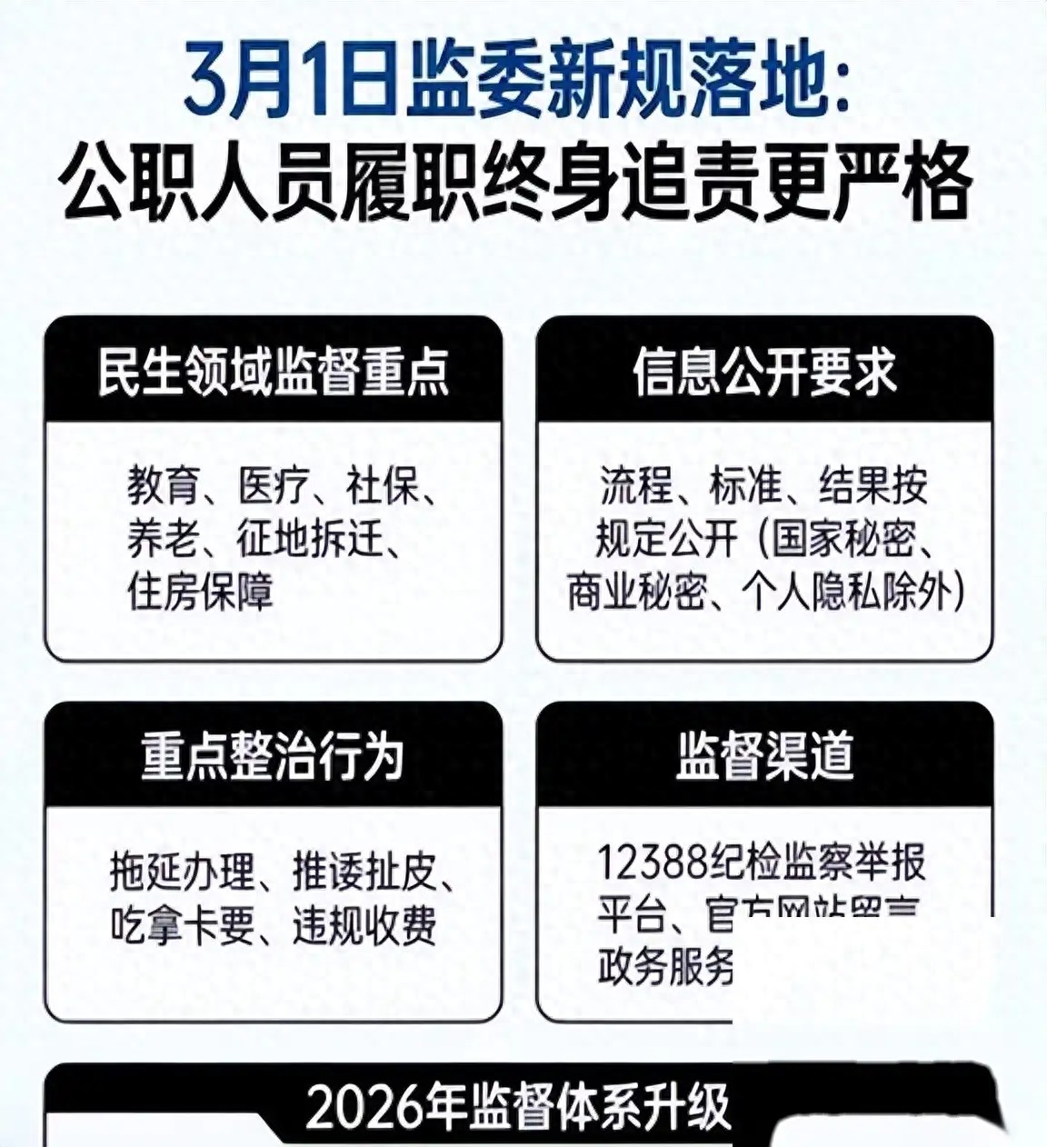 先说那个让很多人心里“咯噔”一下的《监察工作信息公开条例》。从3月1号起,国家监委直接把监察权运作的“底牌”掀开了。以前,很多人觉得监察机关神秘,立案调查到哪一步了、公职人员犯了啥事儿,外头看不太清。现在,九类信息必须主动晒在太阳底下。这就好比给权力装了个24小时直播的摄像头,公职人员行使权力时,哪怕动歪脑筋想“变通”一下,都得掂量掂量身后那双盯着看的眼睛。老百姓办事不用再托人找关系打听进度,手机一刷,政策、程序、受理范围清清楚楚。说白了,就是把那些“躲在暗处”的操作空间给挤压没了,让公职人员习惯在放大镜下干活。