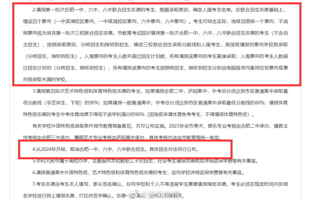 #2023年合肥中考方案发布# 【重磅!#合肥中考2024年开始取消一六八联招# 】刚刚,合肥市教育局发布《关于印发合肥市2023年初中学业水平考试和高中阶段学校招生工作实施方案的通知》,其中提到,从2024年开始,取消合肥一中、六中、八中联合招生。