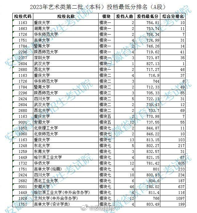 【最新发布!事关投档最低分排名】7月14日,安徽省教育招生考试院发布2023年体育类第一批(本科)投档最低分排名和2023年艺术类第二批(本科)投档最低分排名(A段)↓↓↓ #2023年安徽高考录取结果查询通道开通##2023年安徽一本文科495分理科482分#