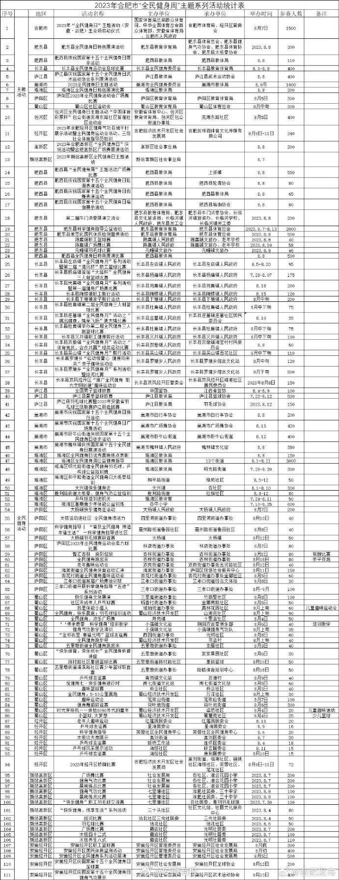 【#合肥这些体育馆将免费开放#】2023年8月8日是我国第15个“全民健身日”,8月8日当天,合肥市将有一批体育场馆免费开放。除此之外,8月上旬,合肥市13个县(市)区、开发区将开展各级各类形式多样、丰富多彩的全民健身活动120余场次,热爱健身的市民,可以就近就便积极参与。