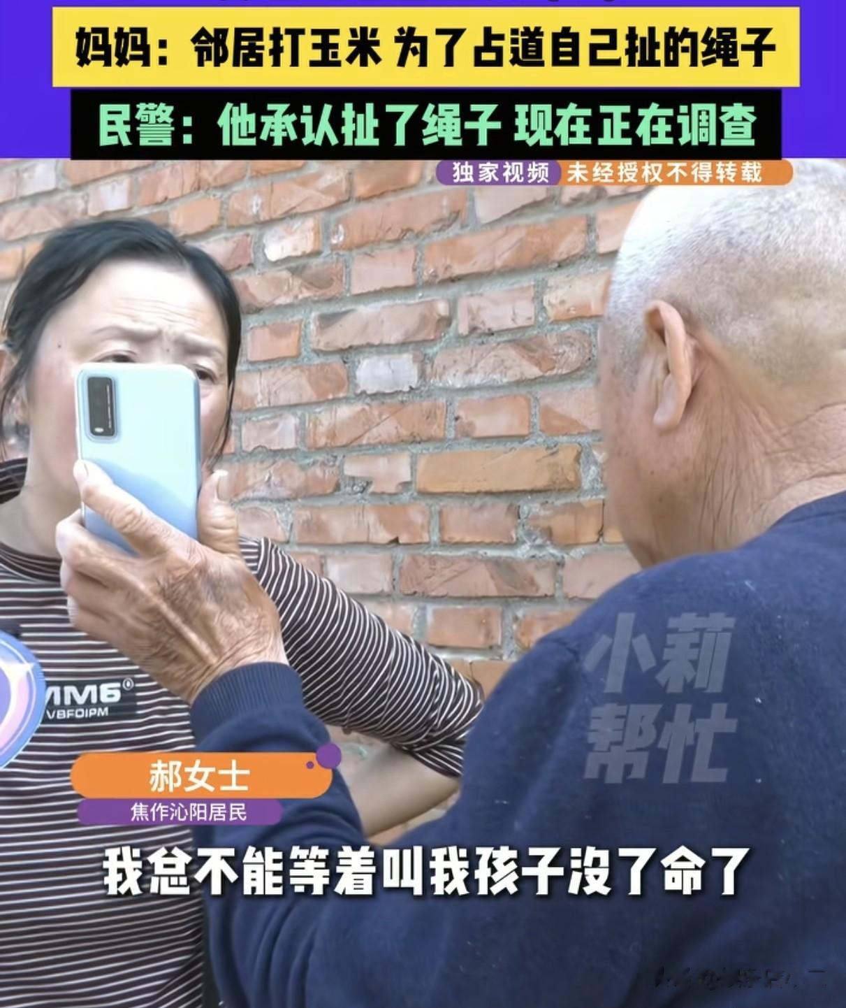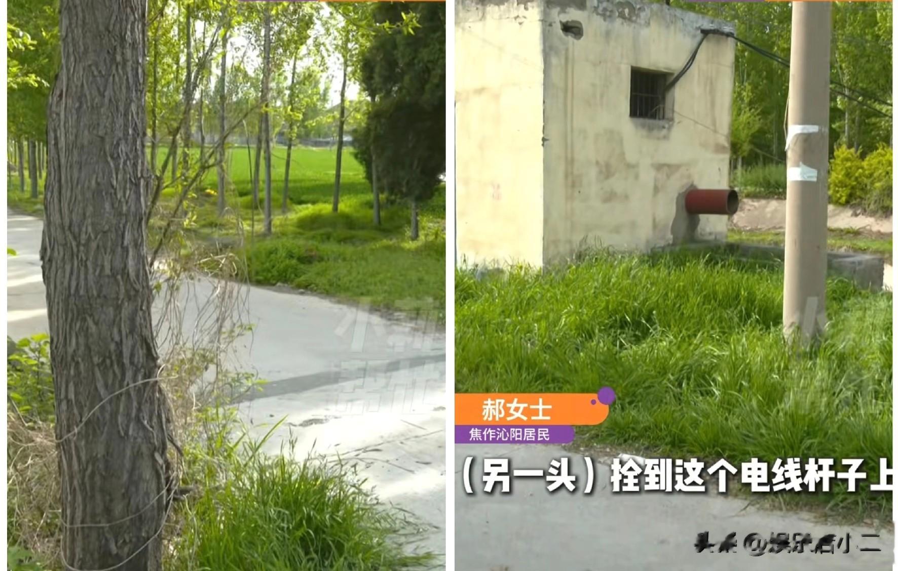 事发地是一条村村通的水泥路,邻居为了能在路上晒玉米,便用绳子绑到路的两边。