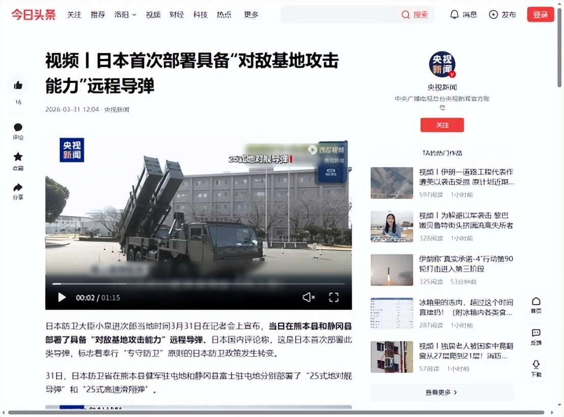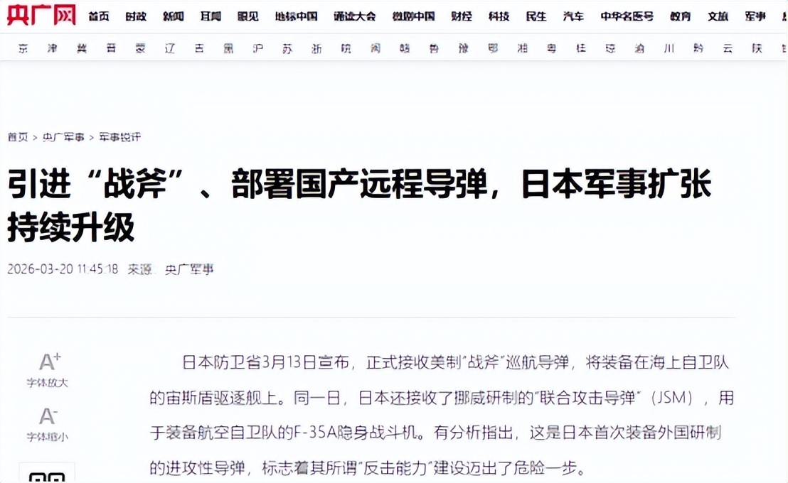 【信源:环球网2026-3-31日本首次部署具备“对敌基地攻击能力”远程导弹,日本当地学者:违反宪法!