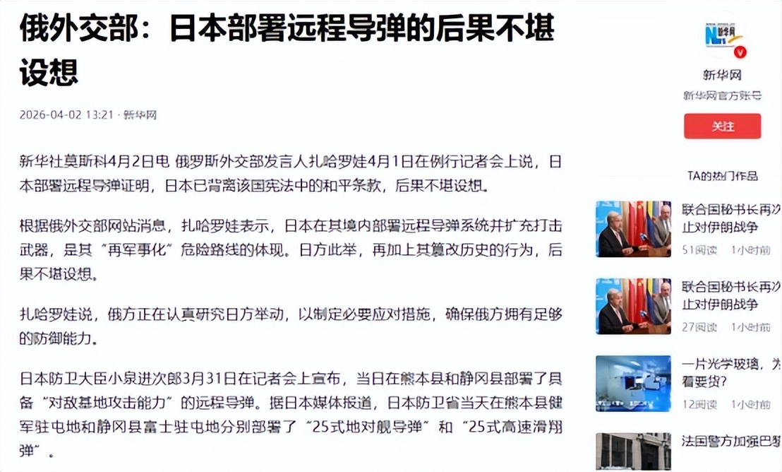 新华网2026-4-2俄外交部:日本部署远程导弹的后果不堪设想】