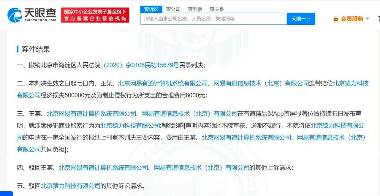 天眼查App显示,近日,北京知识产权法院对网易侵犯商业秘密案做出终审判决:北京网易有道计算机系统有限公司、网易有道信息技术(北京)有限公司及员工王某的行为构成商业秘密侵权,连带赔偿北京猿力科技有限公司经济损失50万元及合理开支,并刊登声明消除影响。