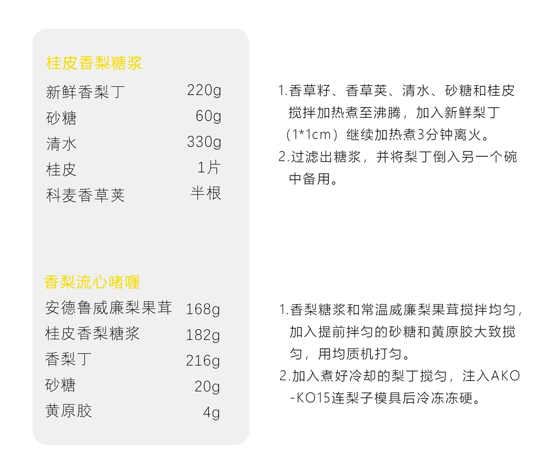 1、冷藏取出的甘纳许打发至可裱挤质地,注入AKOKO8连梨子模具,放入脱模的梨子夹心,抹去多余慕斯液后,冷冻冻硬。