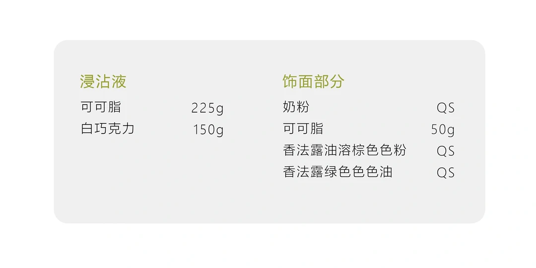 5.在表面依次喷涂绿色色油和调好的棕色可可脂,上色温度为30°C。