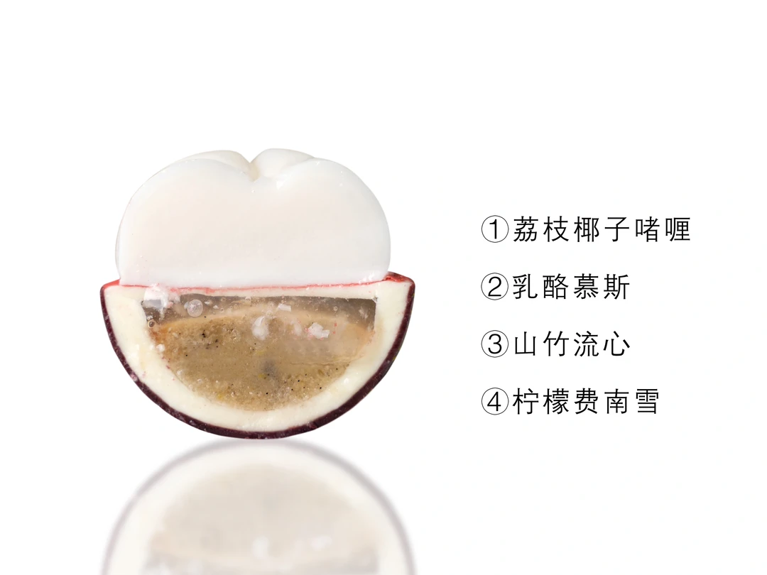 . 今天分享一款清甜甘香、丰润可口的仿真山竹慕斯。 . 配方看图上哦 . 注意要点 1⃣️ 柠檬费南雪 1、黄油和香草籽混合小火加热直至变成深色制作成焦化黄油,散发坚果香气即可。 2、杏仁粉、砂糖、盐、低筋粉和柠檬皮屑搅拌均匀,再加入蛋清搅匀。 3、依次加入柠檬酱、柠檬汁和焦化黄油搅拌成均匀的面糊,保鲜膜密封冷藏静置30分钟。 4、注入15连半圆模具至8成,平炉上下火180°C烤制14-16分钟。 5、出炉冷却后脱模备用。 . 2⃣️ 柠檬糖浆 1、砂糖和清水混合搅拌加热煮沸离火。 2、降温至60°C以下加入柠檬酒搅拌均匀,冷却至室温后备用。 3、将冷却的费南雪放入糖浆中浸泡至充分吸收。 . 3⃣️ 山竹啫喱 1、清水、砂糖和黄原胶混合用均质机打匀。 2、加入山竹果肉搅拌均匀。 . 4⃣️ 荔枝椰子啫喱 1、荔枝果茸、椰子果茸和砂糖混合加热煮沸离火。 2、加入泡好的吉利丁片融化均匀。 3、注入山竹模具冷冻冻硬。 . 5⃣️ 乳酪慕斯 1、牛奶和砂糖混合加热至50°C,依次加入泡好的吉利丁和马斯卡彭搅拌至顺滑质地。 2、淡奶油打发至6成,与步骤2的乳酪基液翻拌成均匀的慕斯液。 . 6⃣️ 成品组装 1、在15连半圆模具中,在蛋糕上注入山竹啫喱至满模,放入冰箱冷冻冻硬。 2、在8连半圆硅胶慕斯模具中注入乳酪慕斯液至8成,放入冻硬脱模的啫喱与蛋糕部分,抹平慕斯液后冷冻冻硬。 3、慕斯脱模后,先在顶部表面喷上紫粉色色油,再整体浸沾深紫色浸沾液,操作温度为35-40°C。 4、用牙刷蘸取适量黄色色油弹到慕斯侧边表面。 5、组装上荔枝椰子啫喱部分。 .