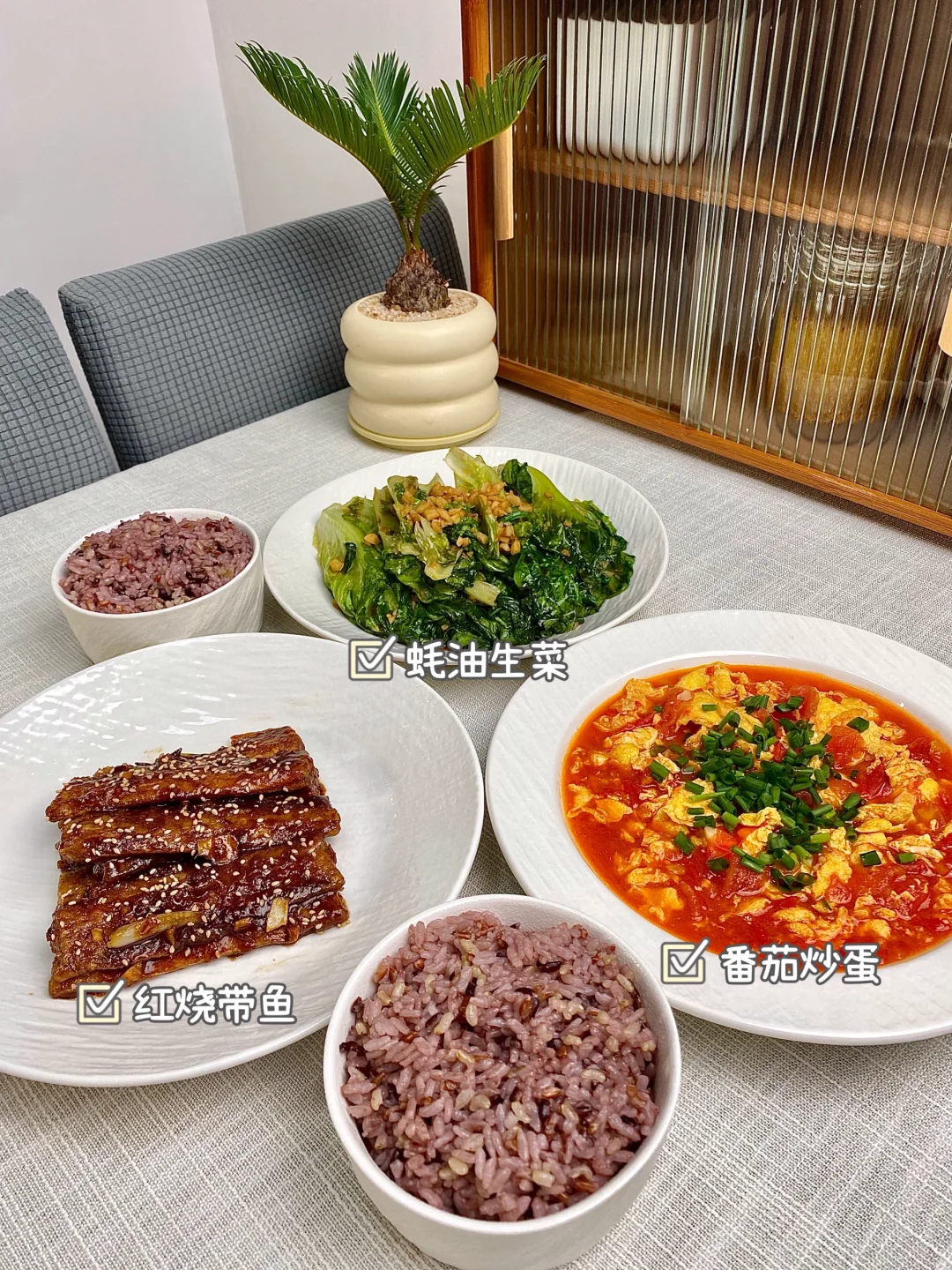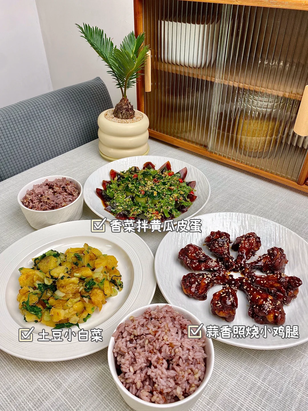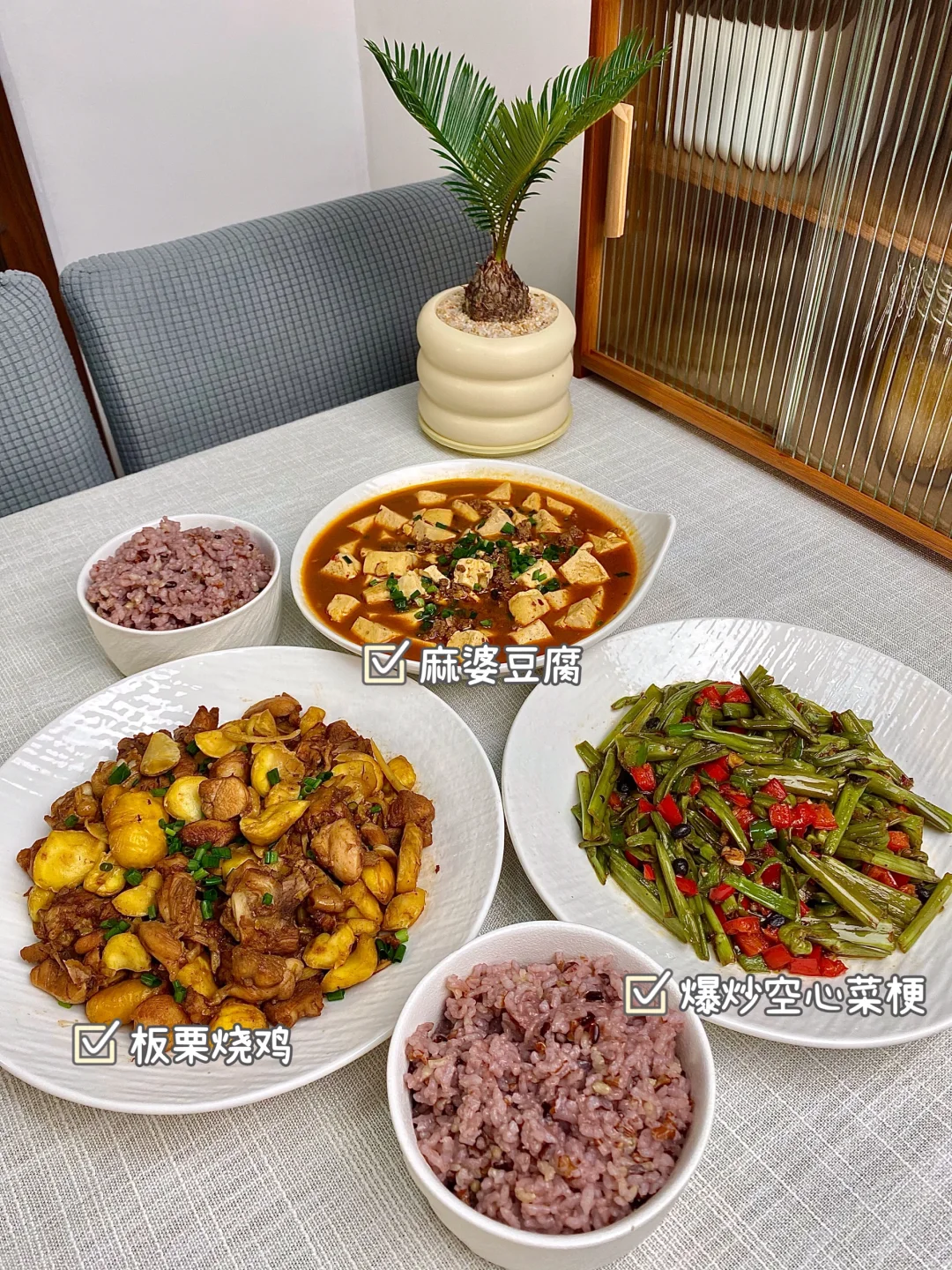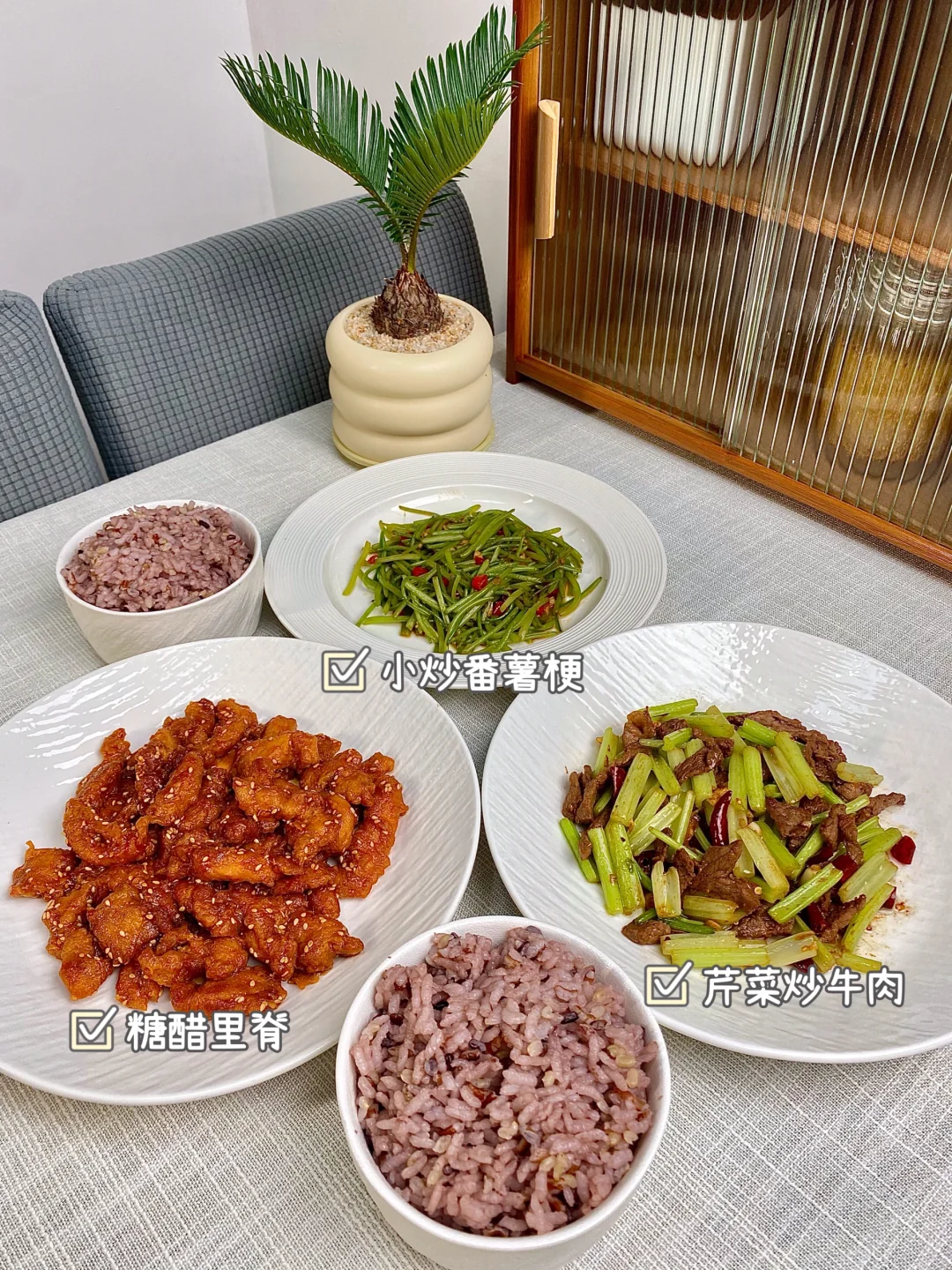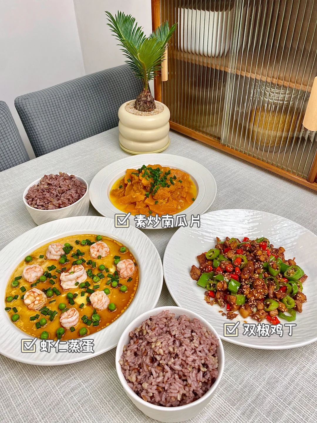 今天晚餐长这样 分享下饭家常菜教程,简单快手又下饭 具体做法主页翻一翻,每道菜都有详细的教程介绍 本周菜单: 1⃣️粉蒸肉、干煸四季豆、凉拌木耳 2⃣️板栗烧鸡、麻婆豆腐、爆炒空心菜梗 3⃣️糖醋里脊、芹菜炒牛肉、小炒番薯梗 4⃣️虾仁蒸蛋、双椒鸡丁、素炒南瓜片 5⃣️蒜香照烧小鸡腿、土豆小白菜 香菜拌黄瓜皮蛋 6⃣️红烧带鱼、番茄炒蛋、蚝油生菜 7⃣️素馅蒸饺、凉拌黄瓜、青菜汤 好好吃饭,拒绝外卖~
