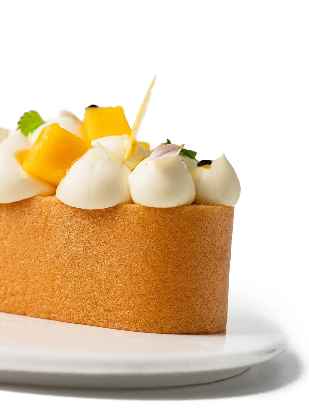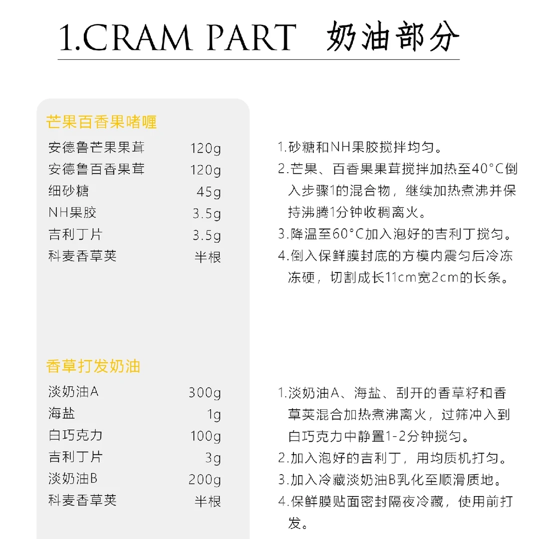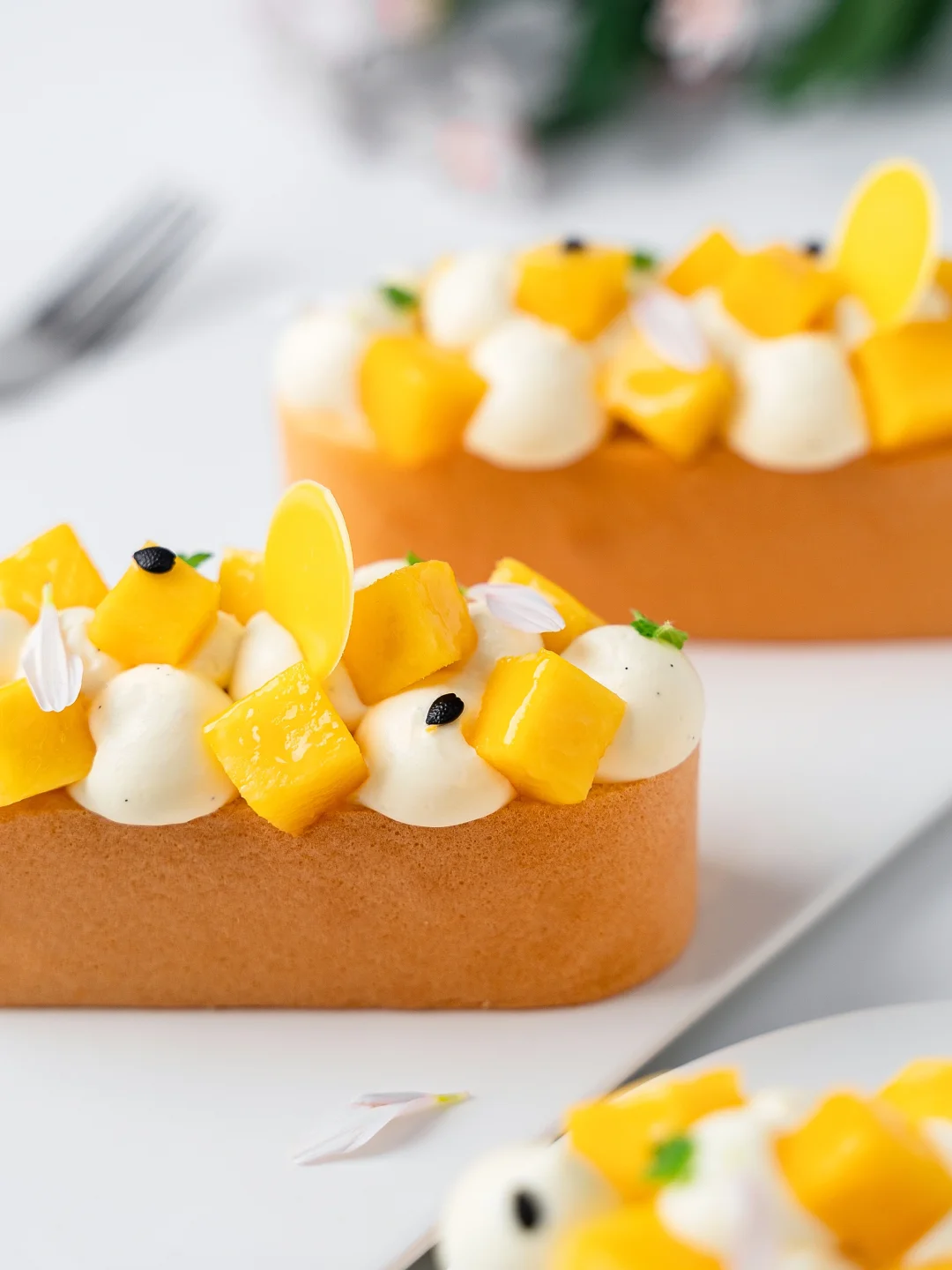 . 🥭今天分享一款适合现在吃的香草芒果蛋糕,口感绵软,奶油细腻[飞吻R] . 🥭配方看图上哦 . 🥭成品组装 1、巧克力插件由调成黄色的调温白巧克力制作,操作用量200克,圆片尺寸直径3cm,方片尺寸边长3.5cm。 2、冷却的蛋糕胚切割成长28.5cm,宽3.5cm的长条,放入玻璃纸内封的长椭圆形挞圈(长13cm),再放入长约11cm宽2cm的蛋糕条。 3、取出香草奶油打发至可裱挤质地,裱挤到蛋糕内,再放入啫喱夹心,继续裱挤奶油至与蛋糕平齐,抹平后冷冻冻硬。 4、脱模后在顶部裱挤上打发香草奶油,放上适量新鲜芒果丁。 5、装饰上薄荷叶、百香果籽、花瓣和巧克力插件。 .