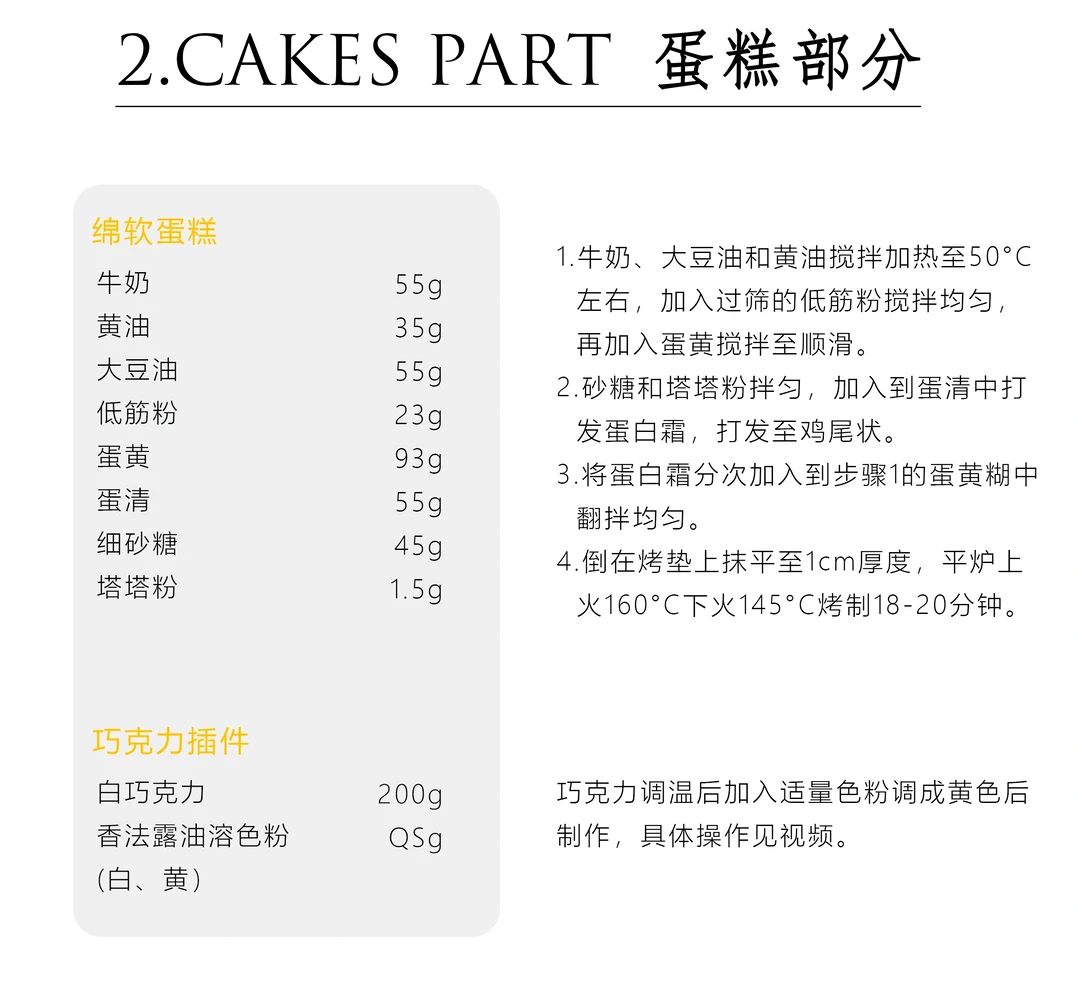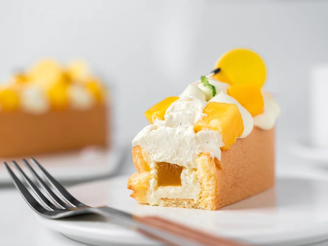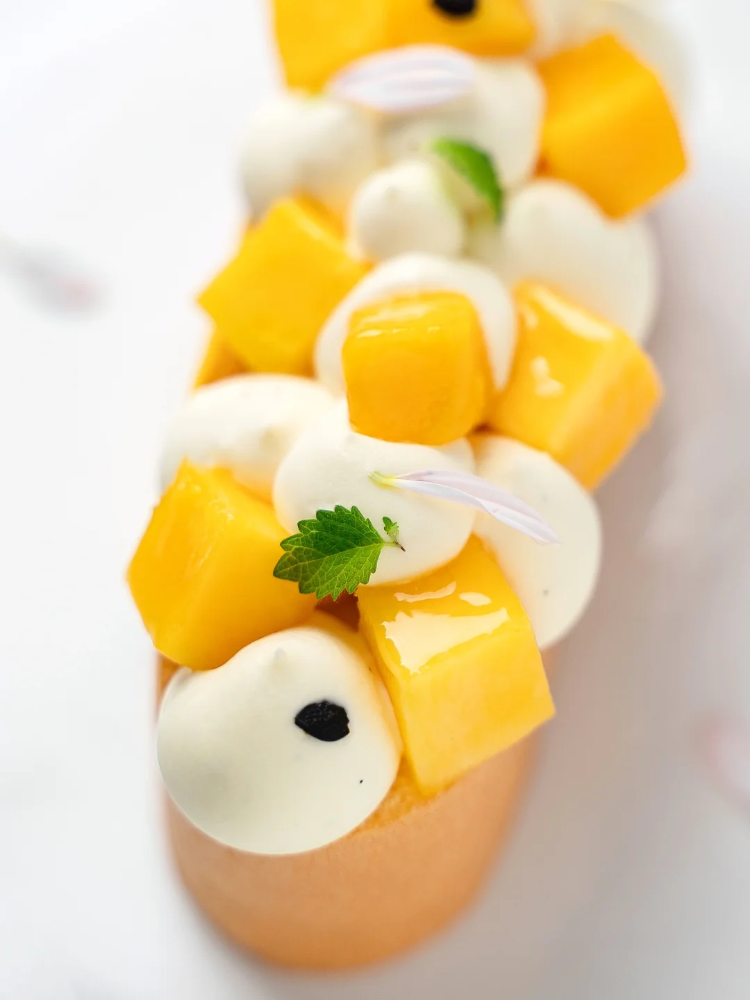 . 🥭今天分享一款适合现在吃的香草芒果蛋糕,口感绵软,奶油细腻[飞吻R] . 🥭配方看图上哦 . 🥭成品组装 1、巧克力插件由调成黄色的调温白巧克力制作,操作用量200克,圆片尺寸直径3cm,方片尺寸边长3.5cm。 2、冷却的蛋糕胚切割成长28.5cm,宽3.5cm的长条,放入玻璃纸内封的长椭圆形挞圈(长13cm),再放入长约11cm宽2cm的蛋糕条。 3、取出香草奶油打发至可裱挤质地,裱挤到蛋糕内,再放入啫喱夹心,继续裱挤奶油至与蛋糕平齐,抹平后冷冻冻硬。 4、脱模后在顶部裱挤上打发香草奶油,放上适量新鲜芒果丁。 5、装饰上薄荷叶、百香果籽、花瓣和巧克力插件。 .