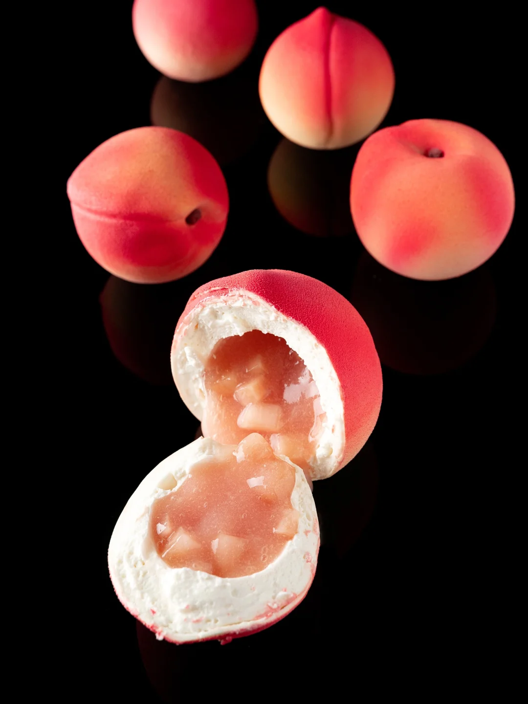 1、取出冷藏的甘纳许打发至可裱挤质地,注入6连半圆模具,放入蜜桃夹心部分后冻硬,在半圆模具中继续注入甘纳许,放上冻硬的半球慕斯,继续冷冻冻硬。