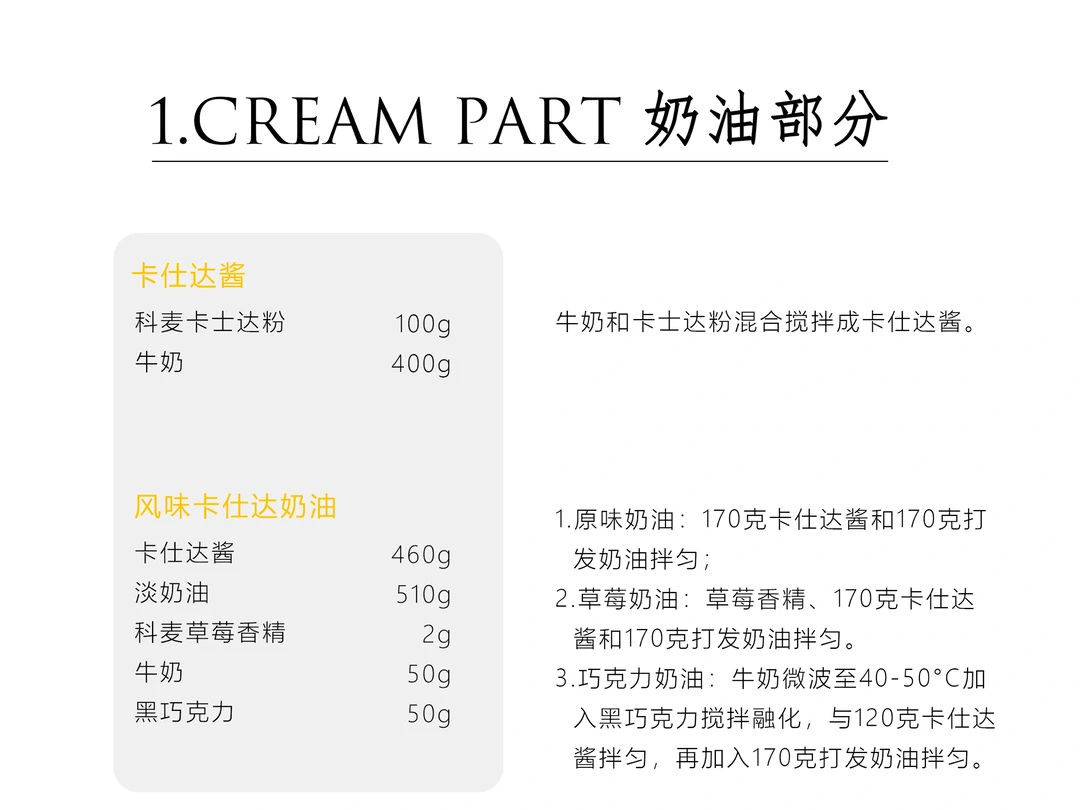 草莓奶油:草莓香精、170克卡仕达酱和170克打发奶油拌匀。