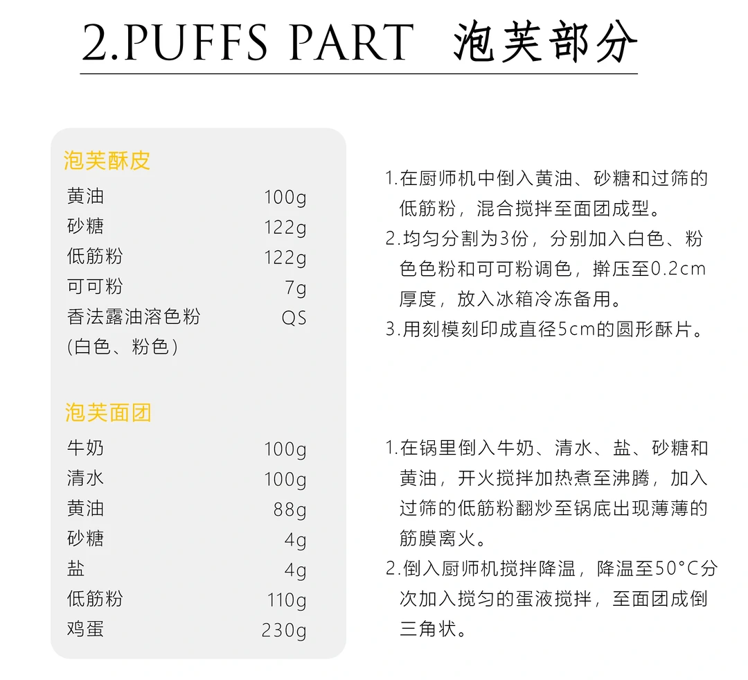 巧克力奶油:牛奶微波至40-50°C加入黑巧克力搅拌融化,加入到120克卡仕达酱中拌匀,再加入170克打发奶油拌匀。