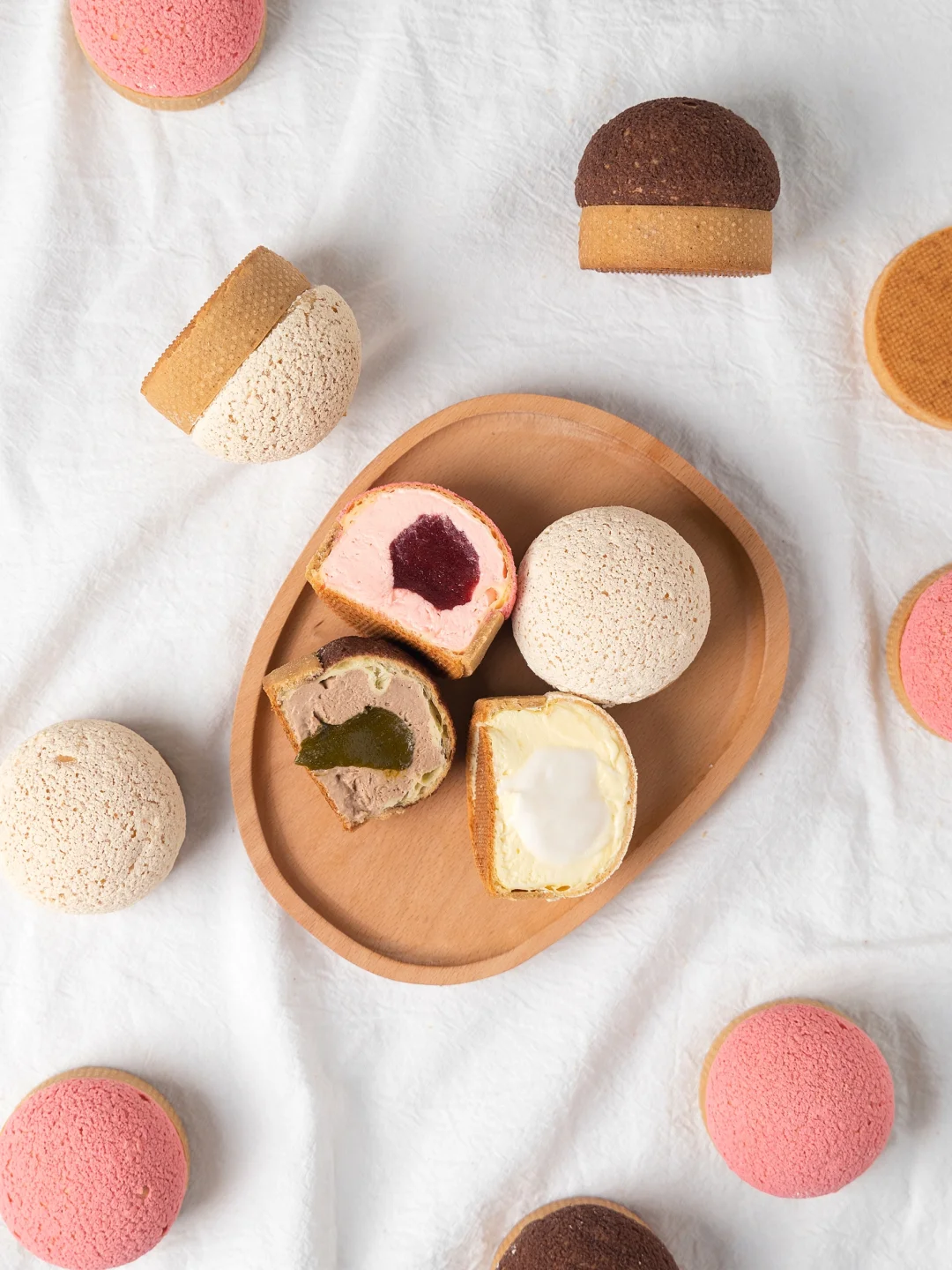 3、出炉后冷却脱模,白色裱挤卡仕达奶油和酸奶馅夹心,粉色裱挤草莓奶油和草莓酱。巧克力色裱挤巧克力奶油和开心果酱。
