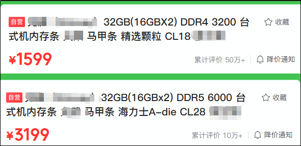 同容量下,DDR4内存价格是DDR5内存价格的一半