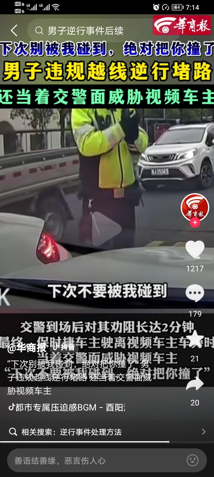 交警就在旁边,刚处理完违法行为,他转头就放狠话。