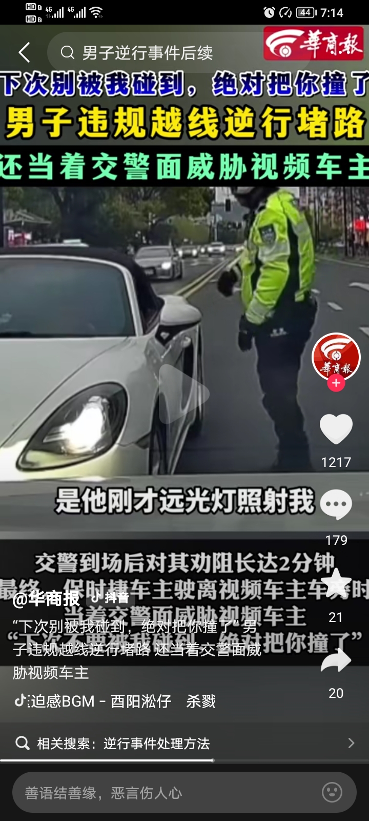 事情的大概经过是这样,保时捷车主先是开远光灯晃人,对方提醒了几句,他干脆直接逆行,把车怼到人家前面不让走。