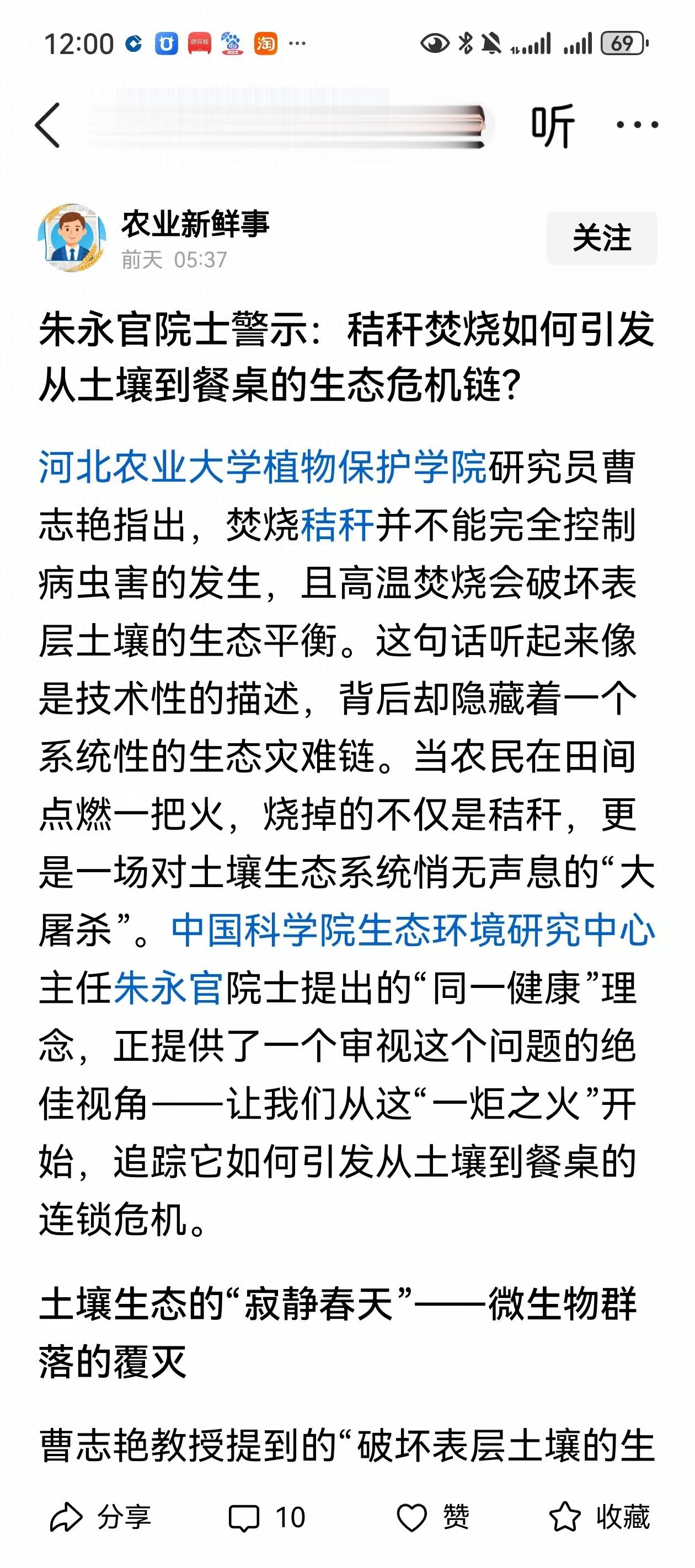 最近一篇打着院士、研究员名头,把秸秆焚烧污名化为“从土壤到餐桌生态危机源头”的文章,在网络上大肆传播。通篇读下来,满篇都是脱离农业生产实际的伪科学话术,是彻头彻尾的因果颠倒、黑白混淆,更是把中国农业生态的系统性问题,一股脑全甩锅给了面朝黄土背朝天的种粮农民,堪称近年来最离谱、最坑农的伪科学闹剧。