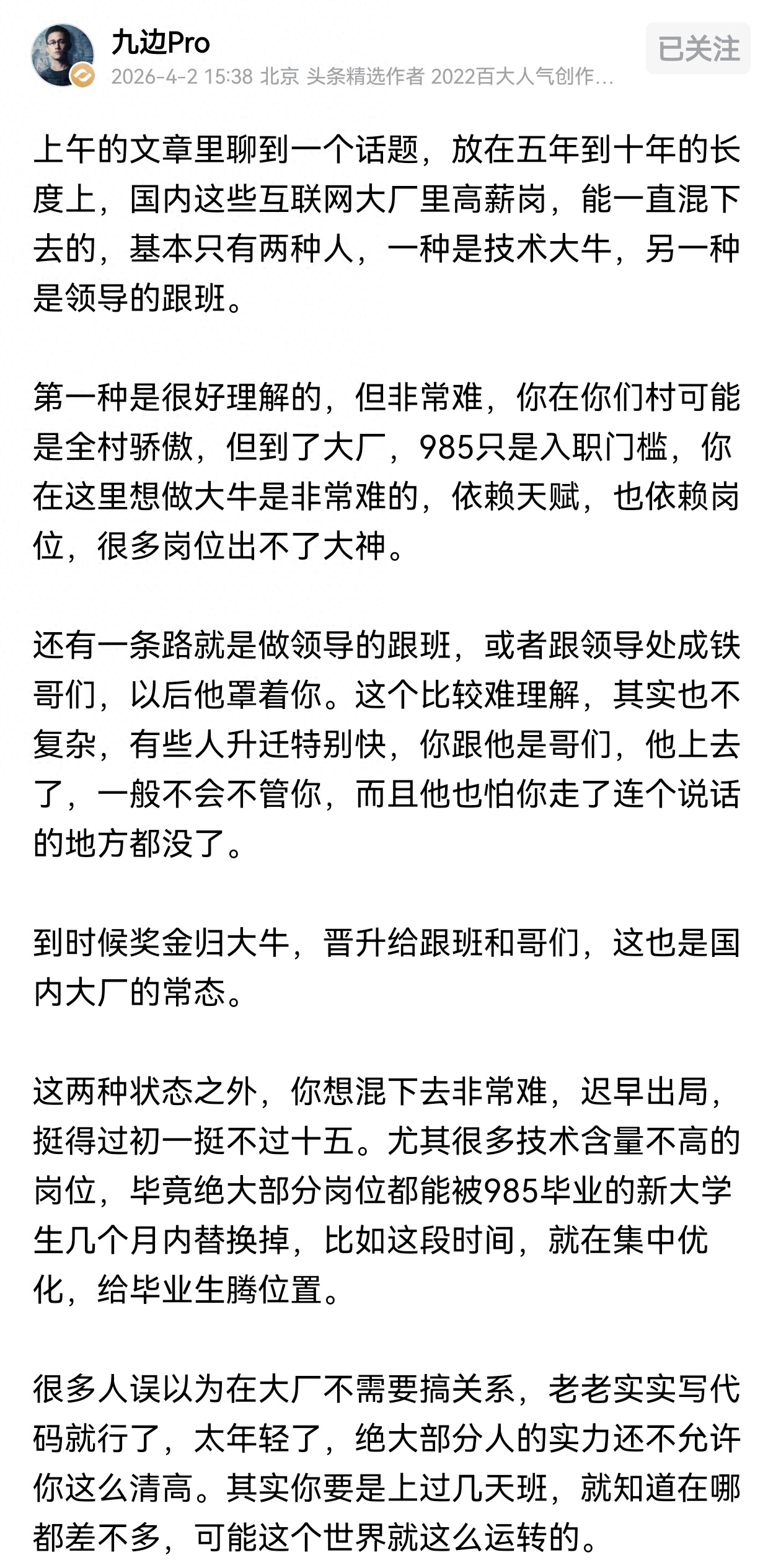 九边发文聊到一个话题,就是长期在一些互联网大厂混下去的,都是什么人的人呢?九边从自己的经验来看,能一直滚下去的就两种人:一种是技术大牛,一种是领导的跟班。
