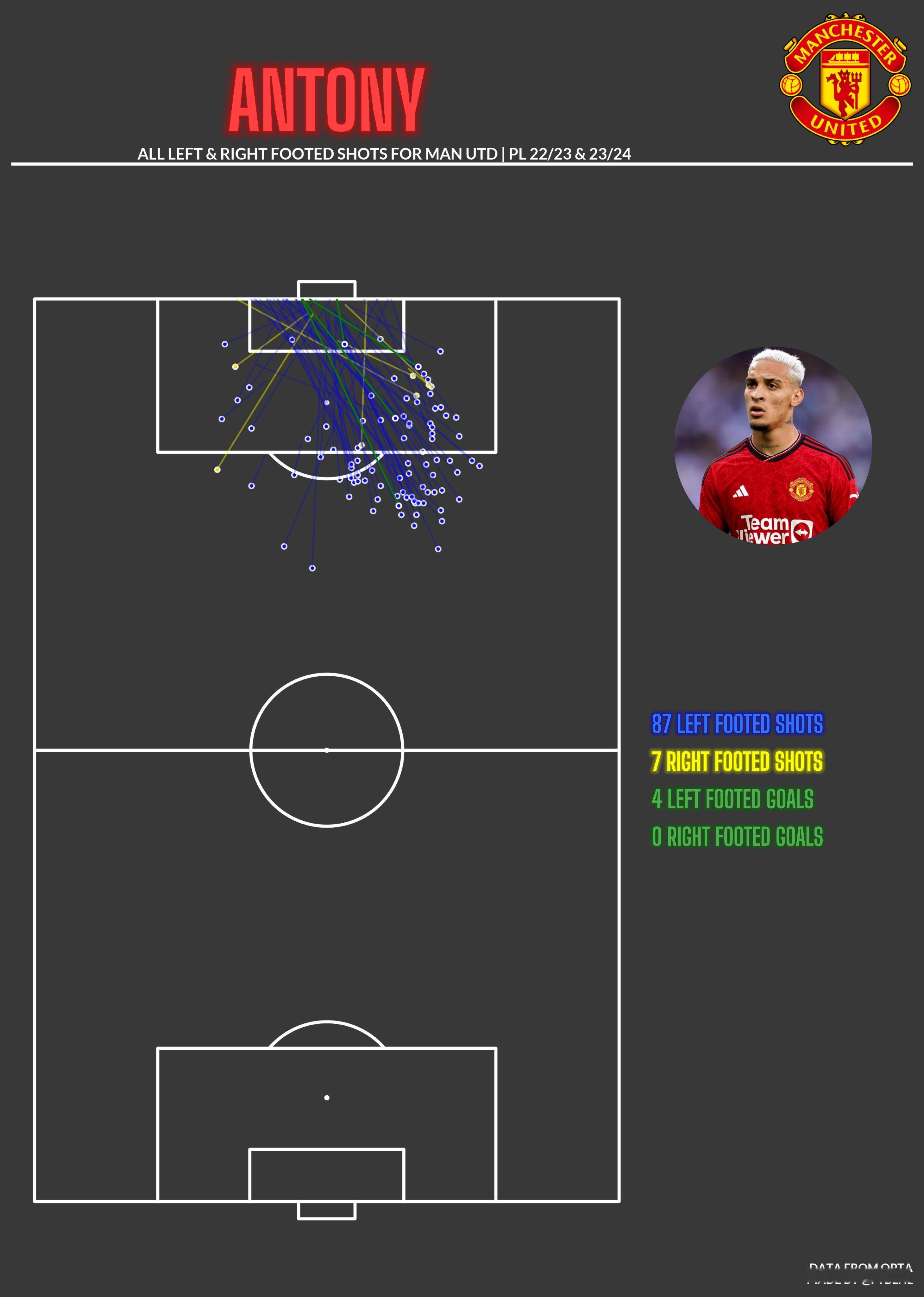 “亿元俱乐部”边锋格拉利什和安东尼近2个赛季的射门统计。