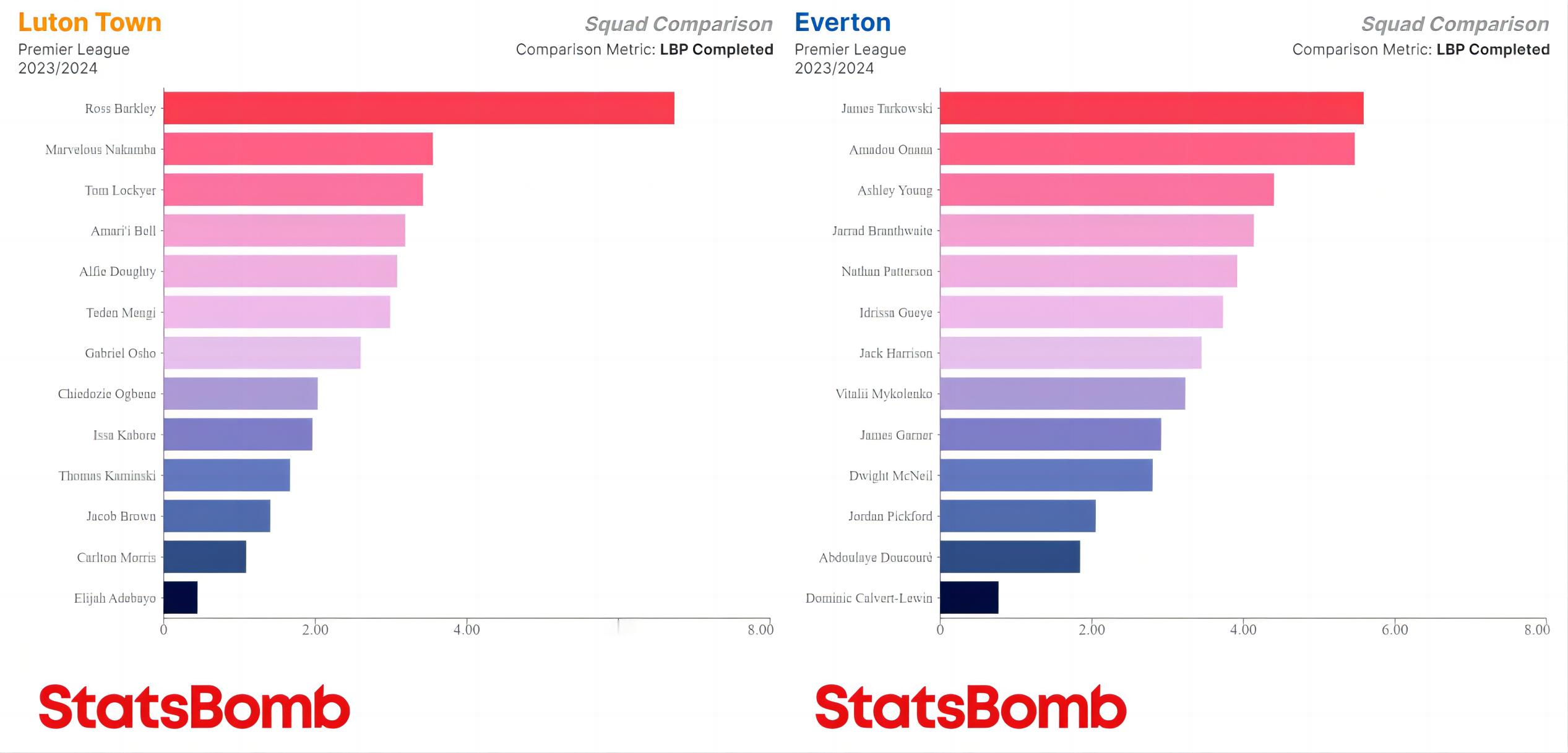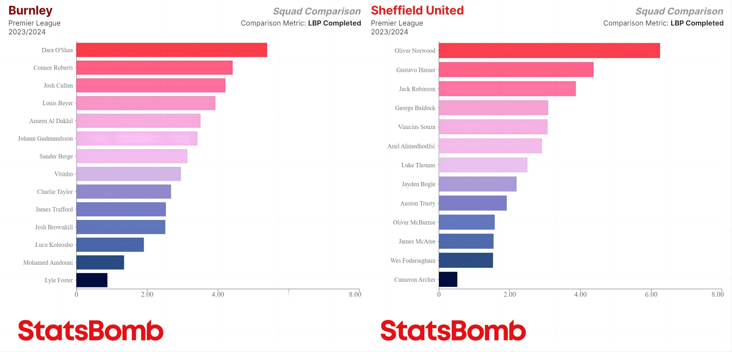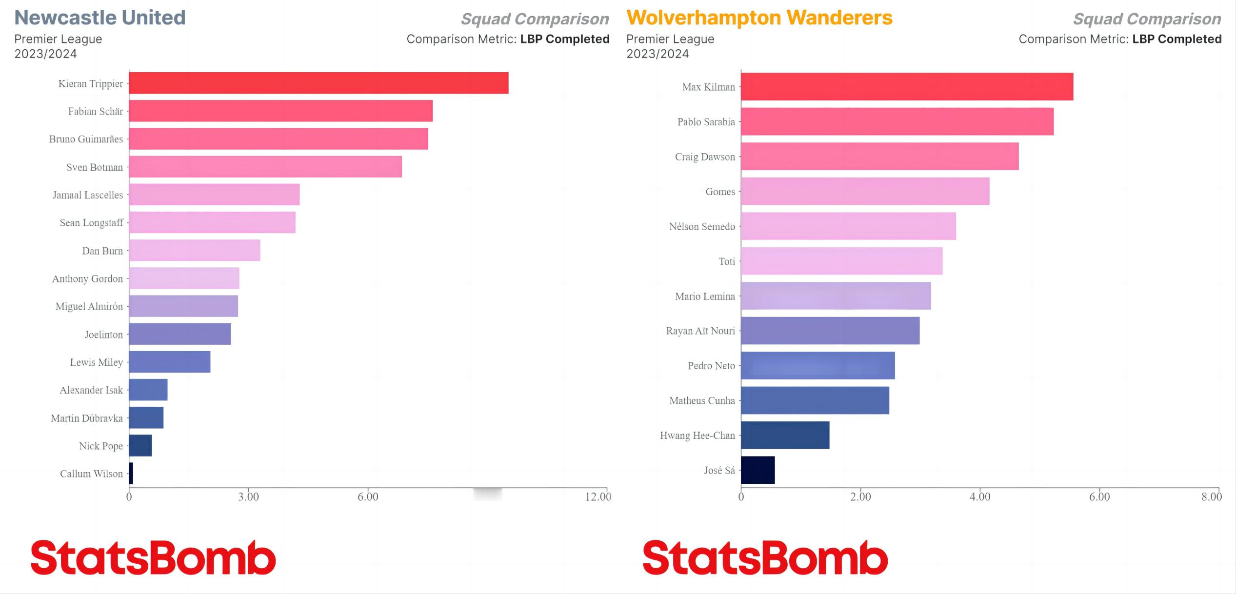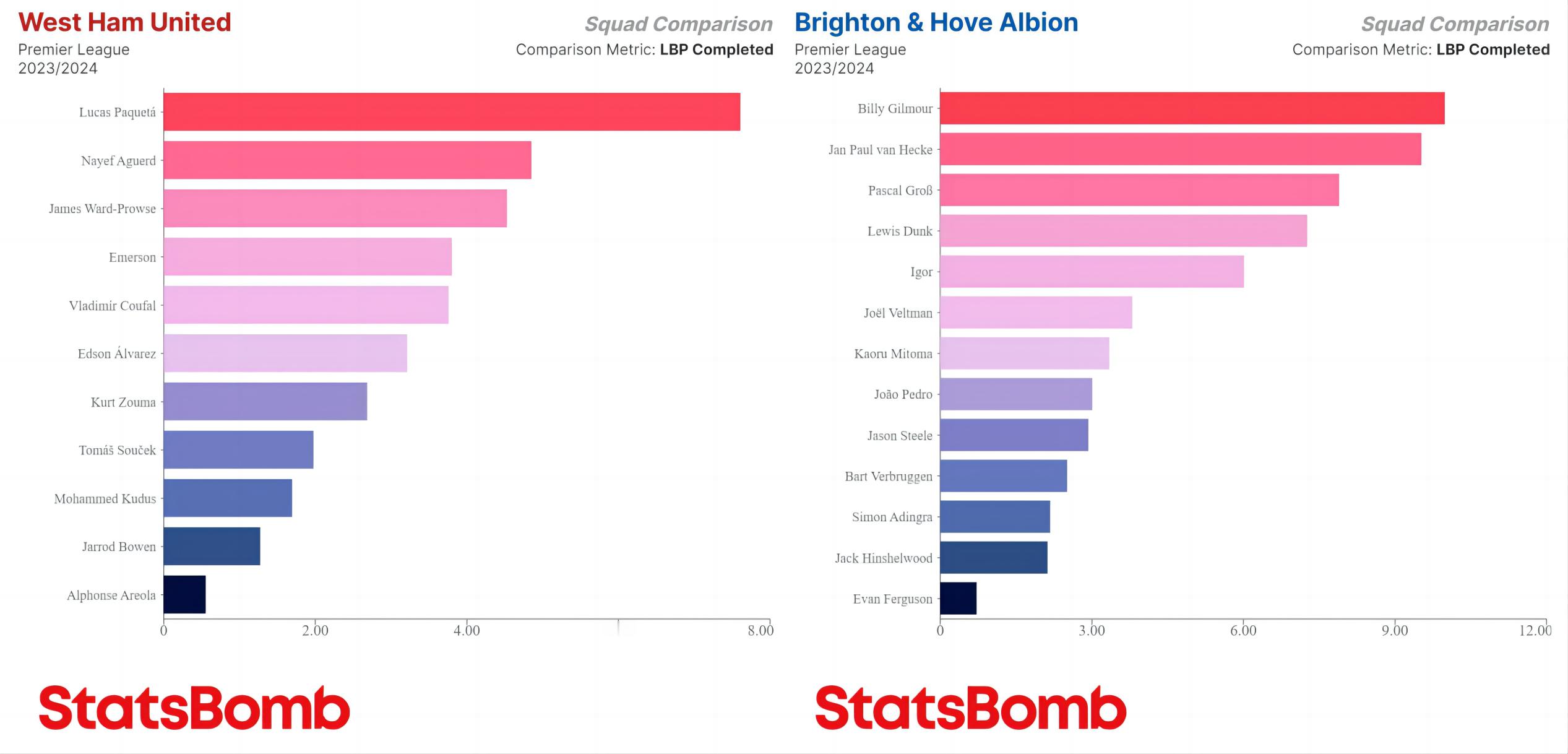 本赛季英超各队每90分钟完成打破对方防线的传球次数最多的球员,基本上集中在中卫、后腰(内收后腰)两个位置上,帕奎塔和巴克利是少有的前场球员。