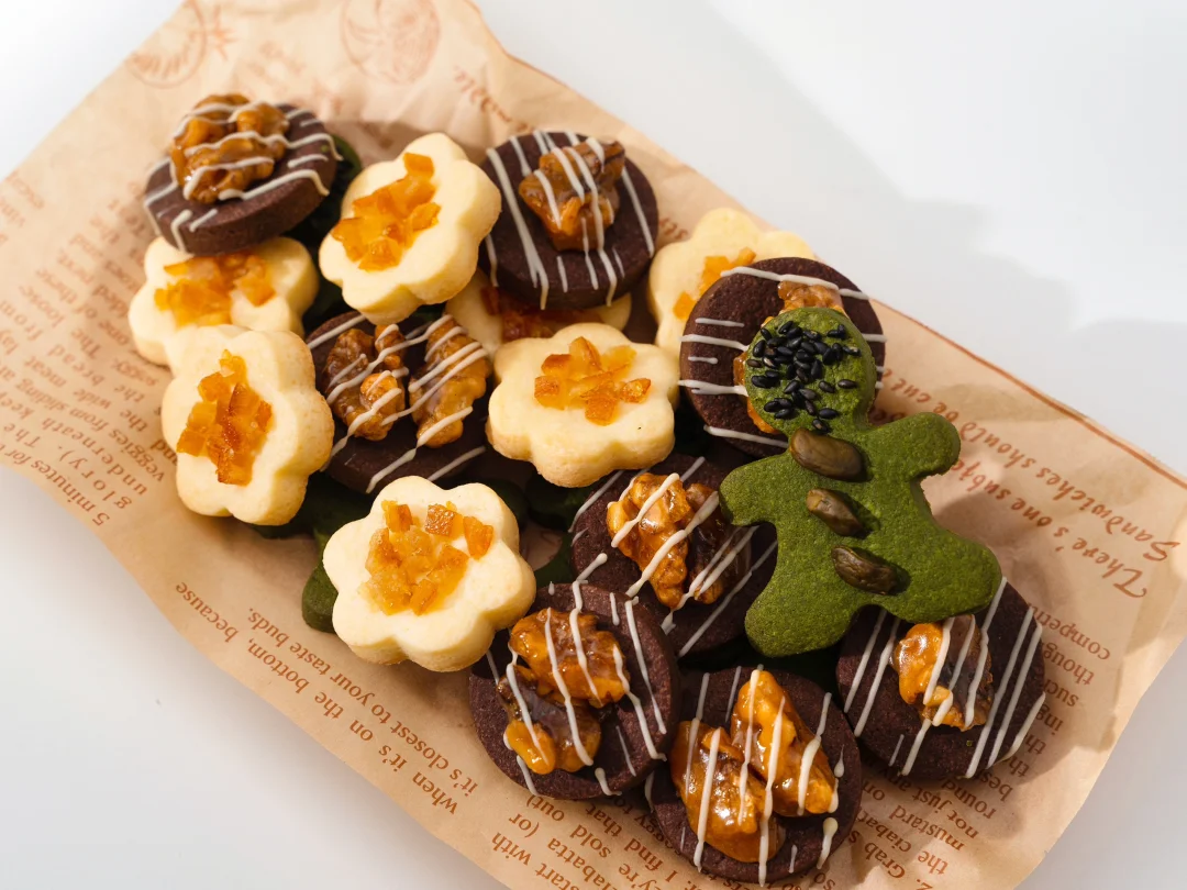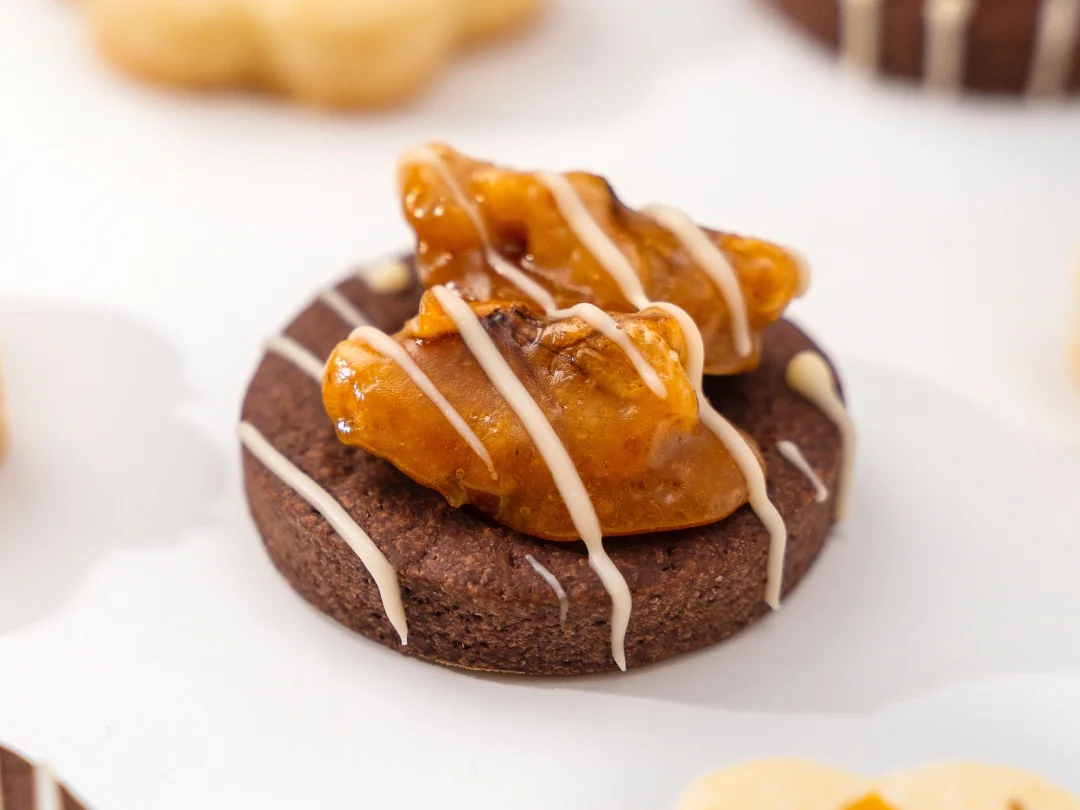 3、可可味:刻印出圆形,先平炉上下火烤制10分钟取出,放上焦糖核桃仁,再次入炉同温度烤制3分钟至焦糖融化后出炉;降温后可裱挤上调好温的白巧克力液作装饰。